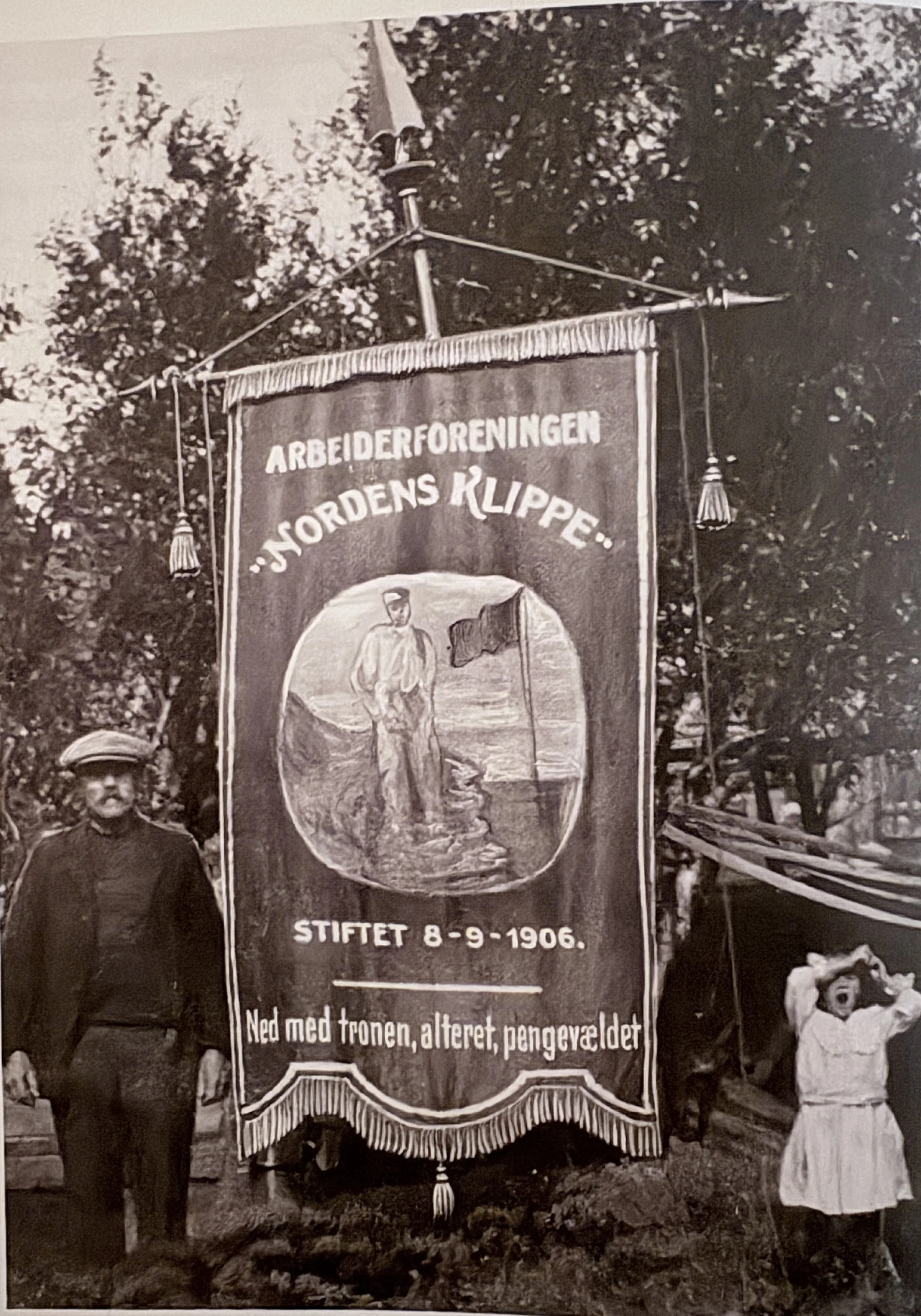 Kort tid etter at Nordens Klippe ble stiftet 8. september 1906 fikk fagforeningen laget en fane med den kjente inskripsjonen «Ned med tronen, alteret, pengevældet». Fanen ble benyttet første gang i 1. mai-toget i Kirkenes i 1907.