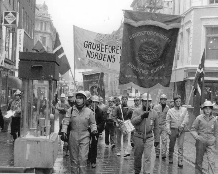 17. mars 1986. Demonstrasjonstoget går opp Karl Johans gate mot Stortinget. Fra venstre fremst i bildet ser vi Grethe Lill Ryeng (fanevakt), Are G. Nilsen (fanebærer) og Ann Hege Larsen (fanevakt). Rune Pettersen bærer det norske flagget, og bak han går Stein Larsen ved siden av trommeslageren fra Sulitjelma Gruvearbeiderforening. Bak Grethe Lill skimter vi Arild Gaska (med solbriller), og til høyre for han, Jarle Simonsen, Ulf Skare og Aron Jensen. Helt til venstre ser vi Kristian Eriksen dele ut løpesedler. (Foto: Odd Harald Kvammen)