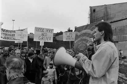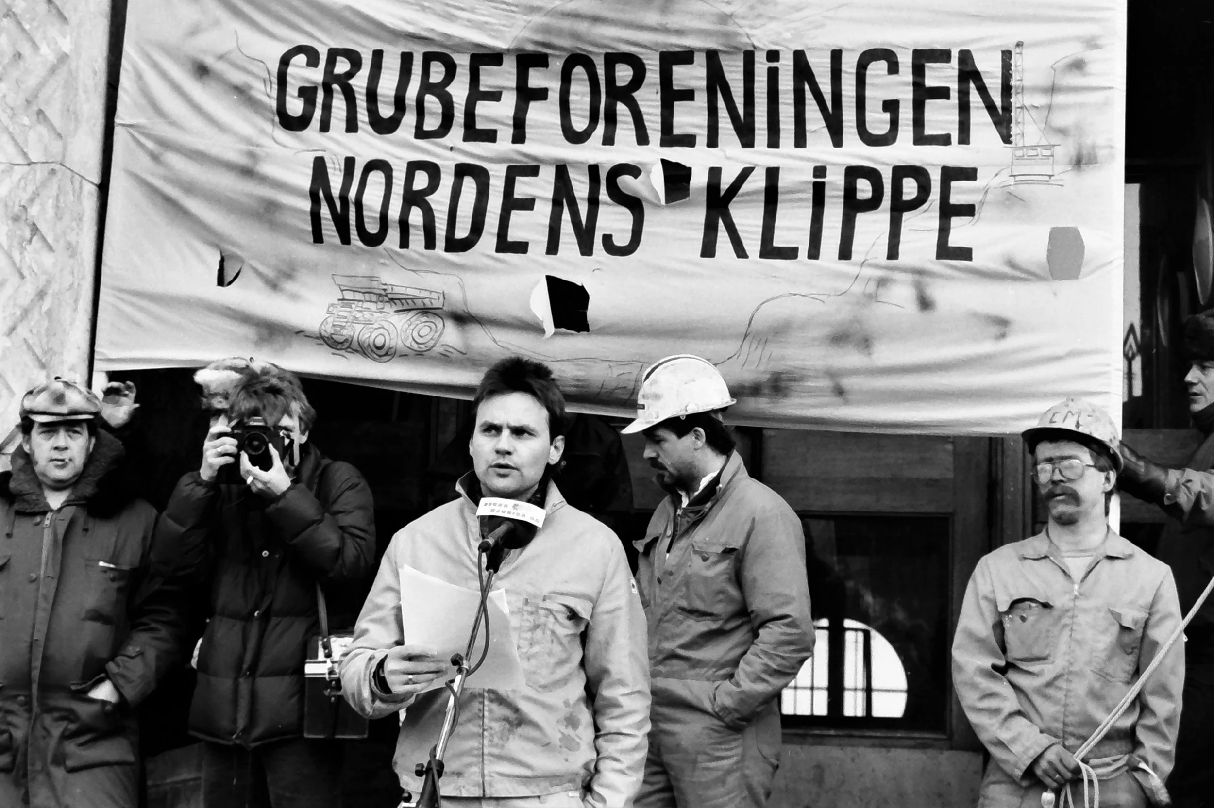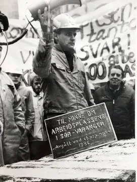14. mars 1986. Grubeforeningen Nordens Klippe holder møte foran administrasjonsbygget til Sydvaranger. Stein Larsen holder appell. (Foto: Johnny Helgesen, Finnmarken)