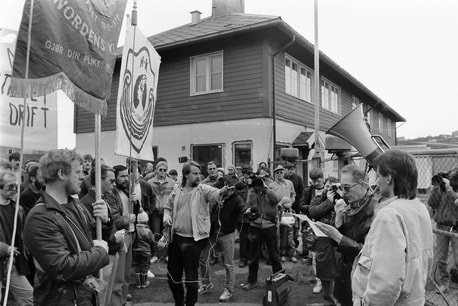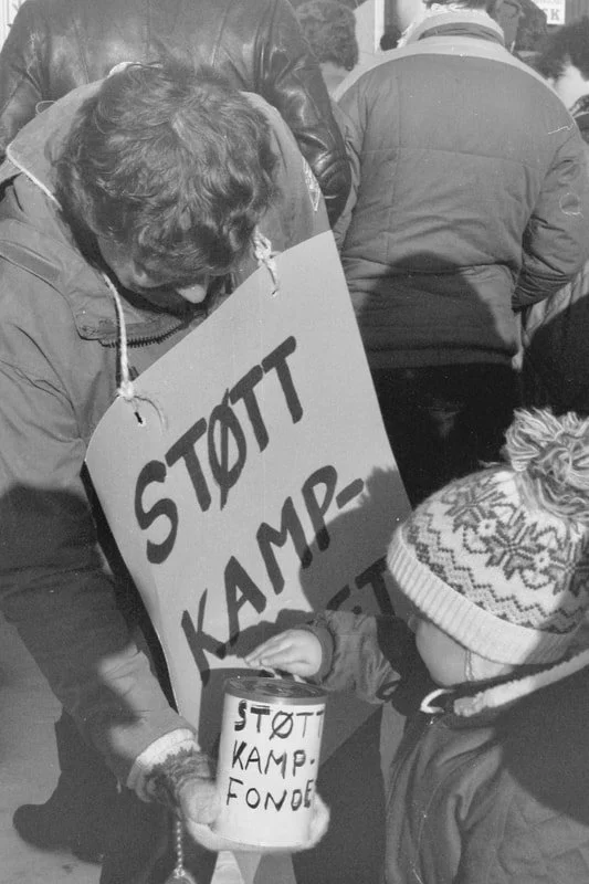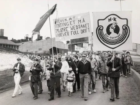 17. mars 1986. Her ser vi en del av sydvarangerarbeiderne som var med på bussturen fra Kirkenes til Oslo demonstrere foran Stortinget. I første rekke fra venstre ser vi Raymond Bendiksen, Kurt Roger Berntsen, Torbjørn Røst, Kristian Eriksen, Tor Reppe, Bengt Eriksson, Arne-Evald Henriksen, Ivar Hvattum med sin sønn Amund. Bak Eriksen skimter vi Helge Hammer som holder parolen sammen med Harald Larsen. Ved siden av Harald Larsen ser vi Arild Gaska med hjelm og solbriller. (Foto: Johnny Helgesen, Finnmarken)