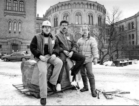 17. mars 1986. Malmsteinen er akkurat plassert foran Stortinget. Trepallen er fortsatt på plass, men vil straks bli slått i stykker med slegger som ble hasteinnkjøpt for å hindre at malmsteinen lett kunne fjernes. På bildet fra venstre Are G. Nilsen, Morten Eggen og Charles Mortensen, som skulle passe på steinen til demonstrasjonstoget kom til Stortinget. (Foto: Arne Roy Markussen)