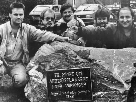Malmsteinen ble plassert foran Stortinget i forbindelse med demonstrasjonen 17. mars 1986 og var ment som gave til Stortinget fra Grubeforeningen Nordens Klippe. Etter at politiet i Oslo fjernet malmsteinen, ble den fraktet tilbake til Kirkenes og satt foran det som var tillitsmannskontoret til Grubeforeningen Nordens Klippe. Her ser vi fra venstre Stein Larsen, Charles Mortensen (senere formann i fagforeninga), Ulf Skare, Halle Mikkelborg (overtok som hovedtillitsmann etter Stein Larsen) og Per Johan Olsen (Pelle), formann i Grubeforeningen Nordens Klippe. (Foto: Sør-Varanger Avis, sannsynligvis i 1987.)