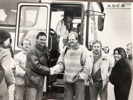 16. mars 1986. Bussturen fra Kirkenes til Oslo i forbindelse med stortingsbehandlinga av Sydvarangers fremtid. 30-40 fra Nordens Klippe deltok på turen som gikk direkte til Oslo. Slitne og trøtte deltakere blir møtt av Andre Kaarud fra verkstedklubben ved Asea Per Kure i Oslo, som hjalp fagforeninga med praktiske ting i forbindelse med markeringa foran Stortinget. Fra venstre: Grethe Lill Ryeng (med ryggen til), Charles Mortensen, Stein Larsen hilser på Andre Kaarud, Harald Larsen, Torgunn Larsen og Hugo Wartiainen. (Foto: Per Kristian Olsen, Sør-Varanger Avis)
