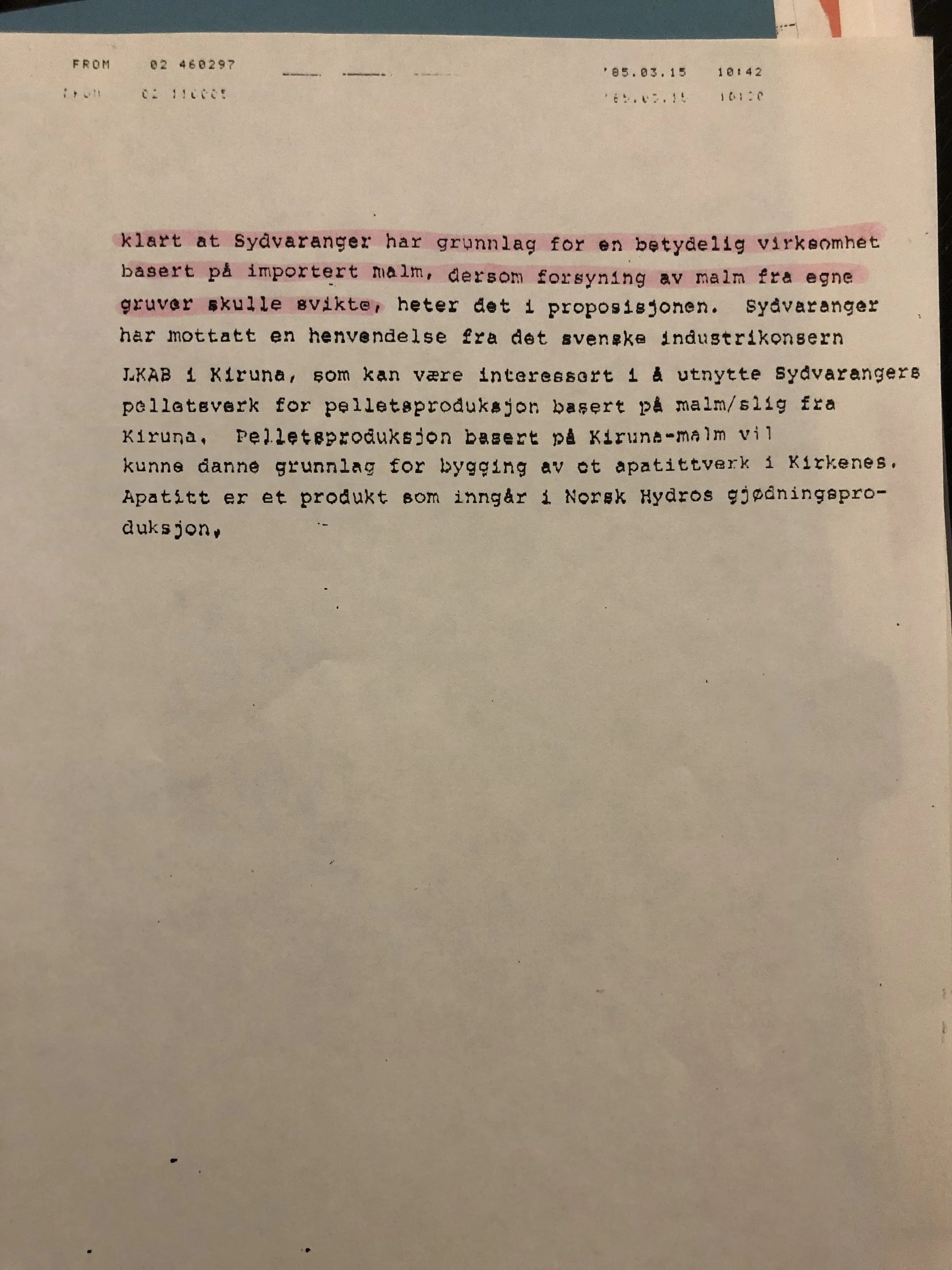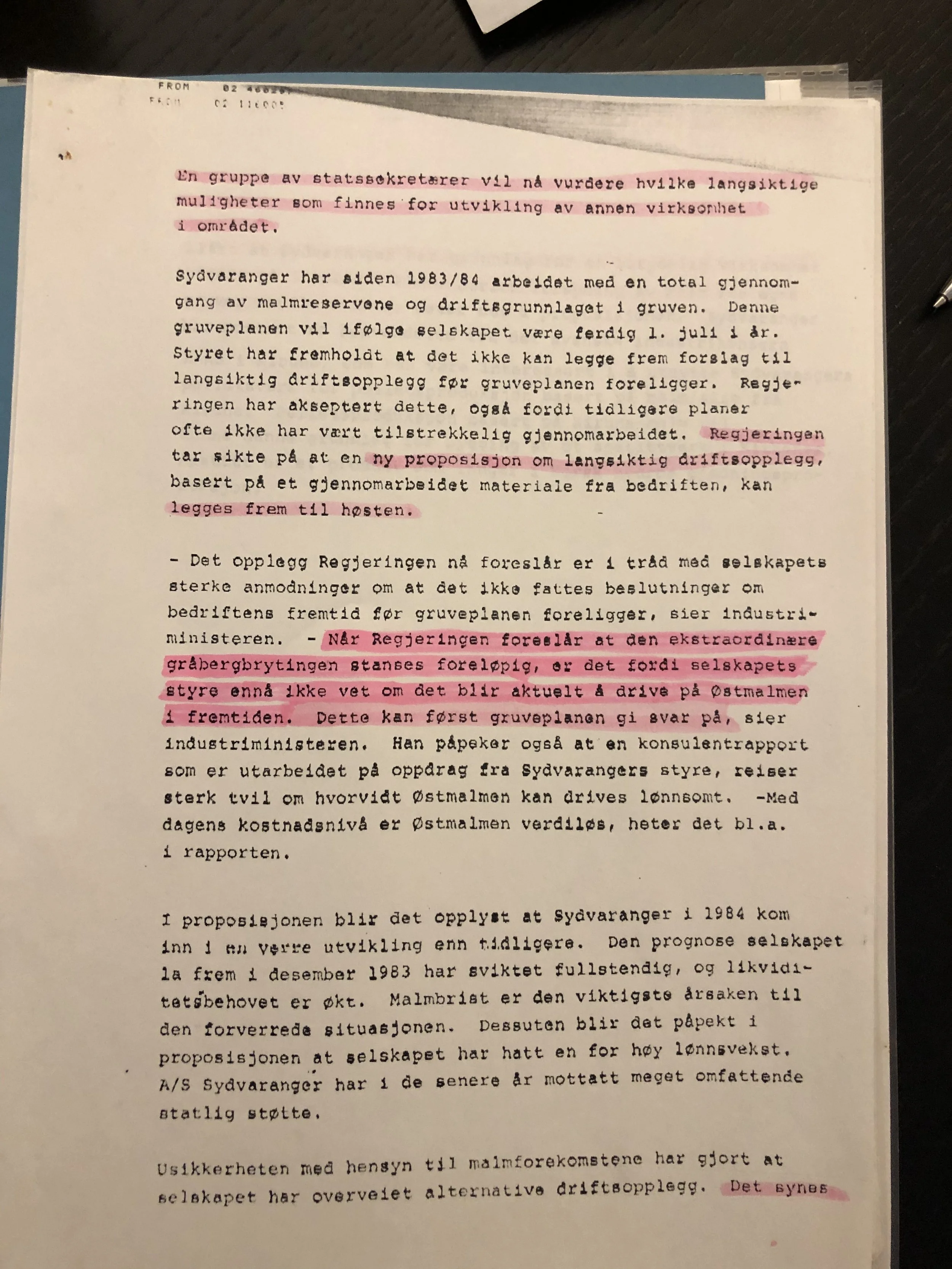 14. mars 1985 sendte Industridepartementet ut en pressemelding om at Regjeringen ville stanse gråbergbrytinga på Østmalmen. Dette hadde Grubeforeningen Nordens Klippe vært forberedt på i lang tid. Men nå ble det klart for alle hva som kom til å skje og forberedelsene til den kommende kampen for arbeidsplassene og bosettinga kom inn i en ny fase.