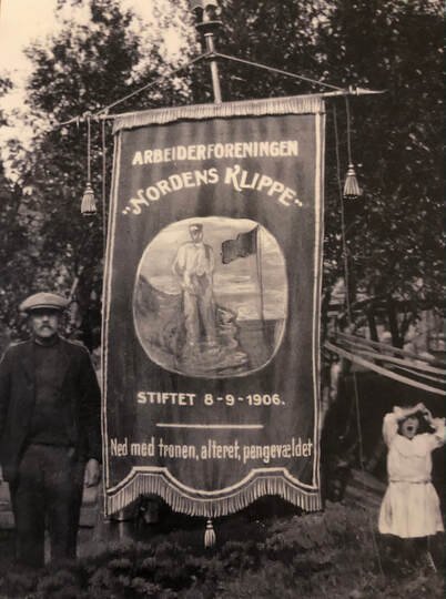 Og på fagforeningens første fane sto det: “Ned med tronen, alteret, pengevældet”.