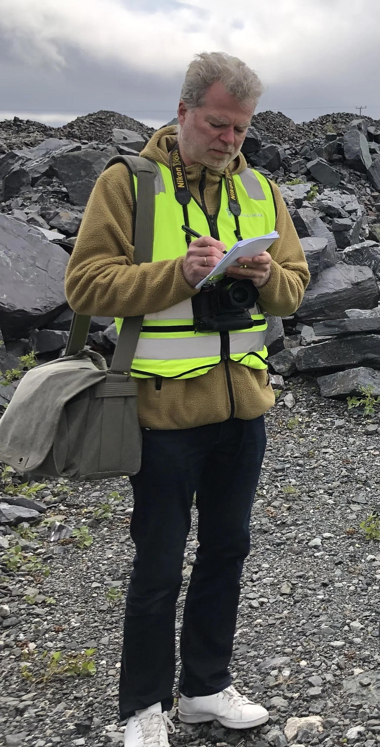 Yngve Grønvik, journalist i Sør-Varanger Avis, på reportasje i gruva i Bjørnevatn 21. juli 2023 da vi arbeidet med å finne malmsteiner til fundamentet til minnesmerket over Nordens Klippe. Foto: Stein Larsen