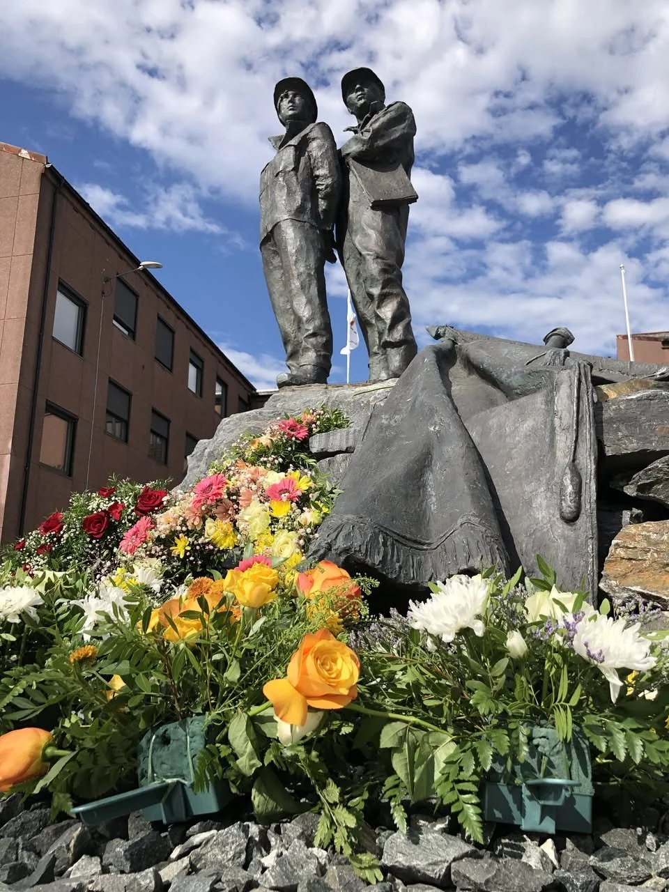 Blomster fra begravelsen 11. juli 2025 ble lagt på Minnesmerke over Nordens Klippe. Foto: Stein Larsen