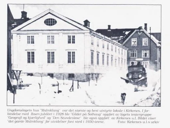 Malmklang slik det så ut etter bygginga i 1924. Kulturhuset var en gave fra AS Sydvaranger til Kirkenes Ungdomslag, og skulle være en motvekt til arbeiderbevegelsens kulturtilbud på Folkets Hus. Foto Grenselandsarkivet