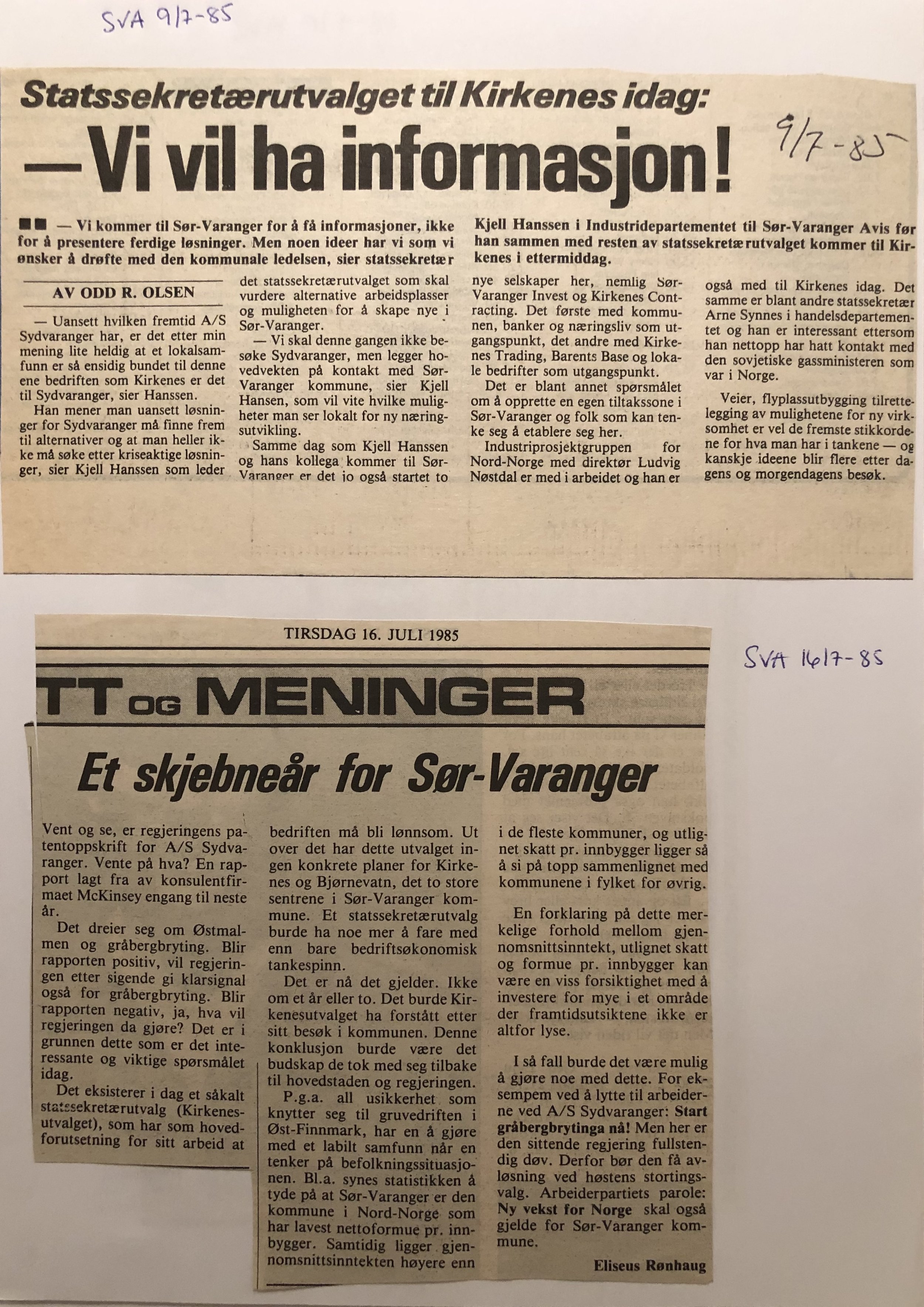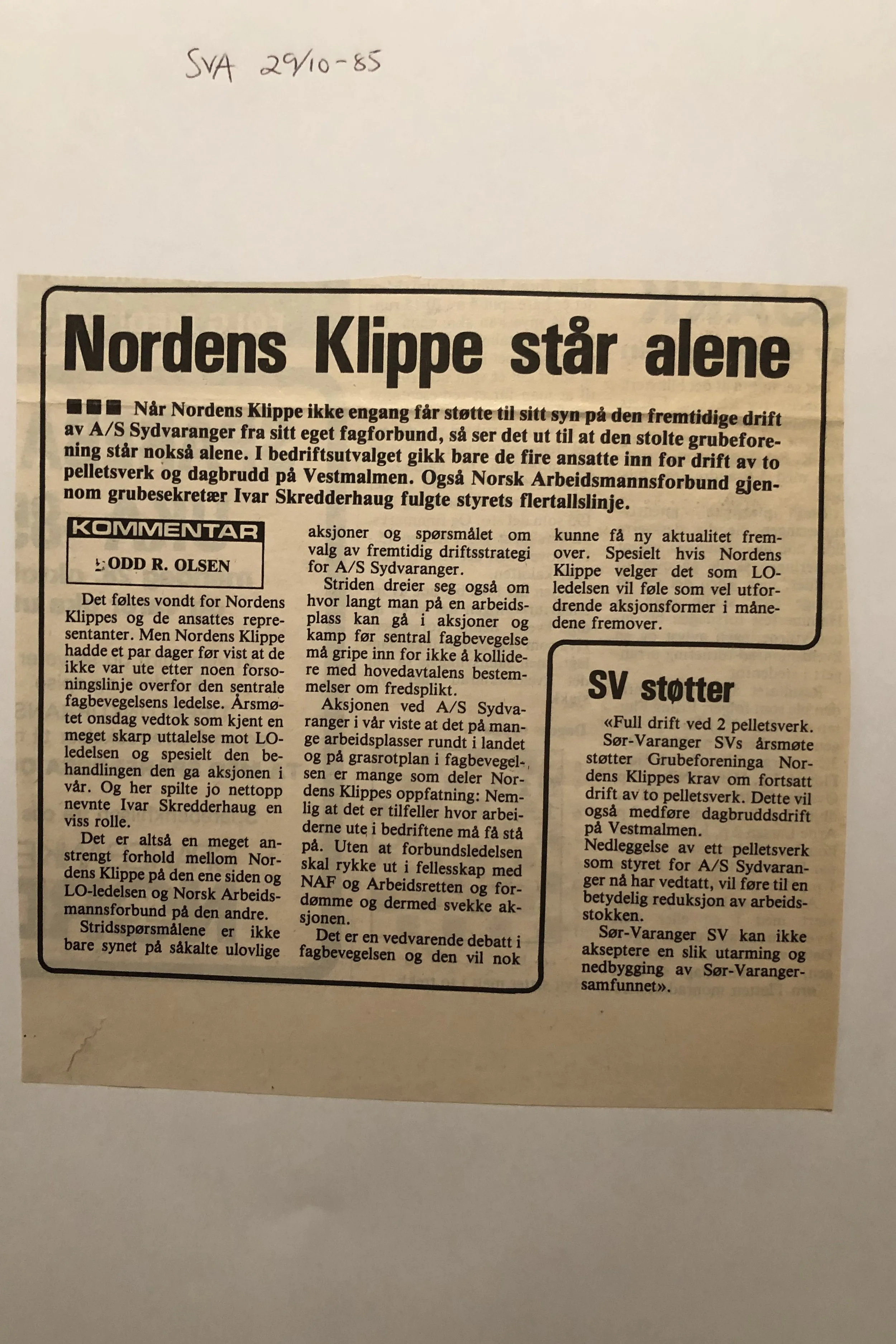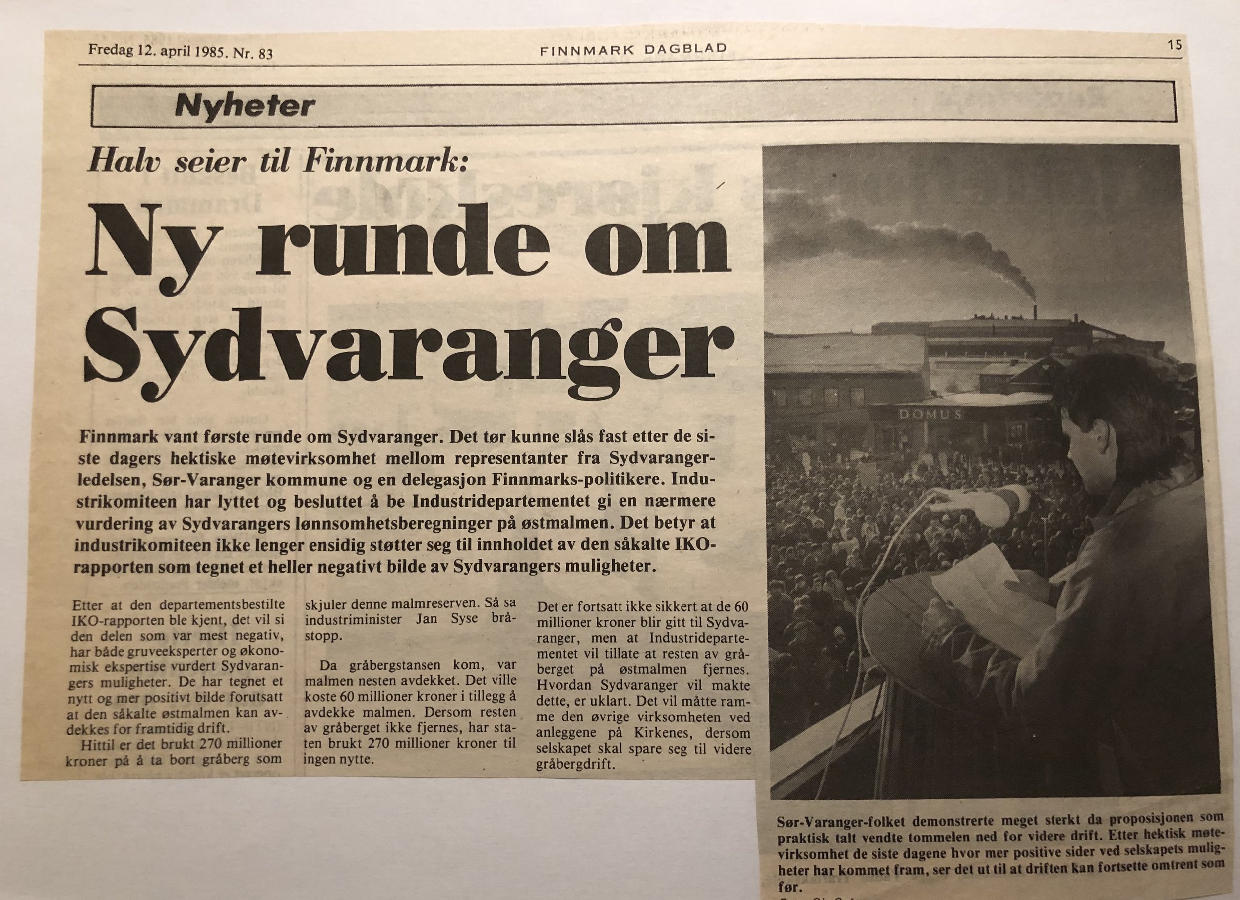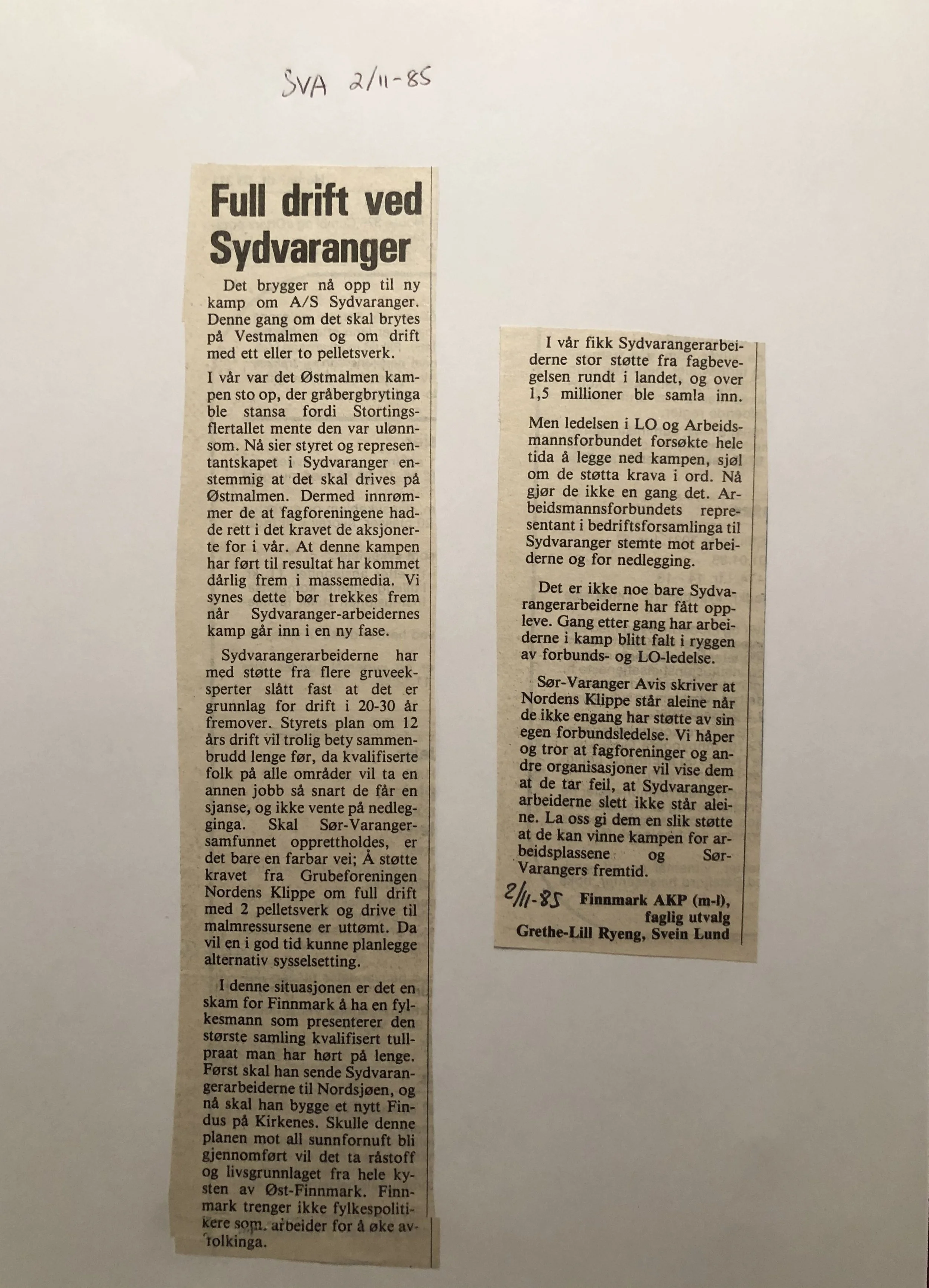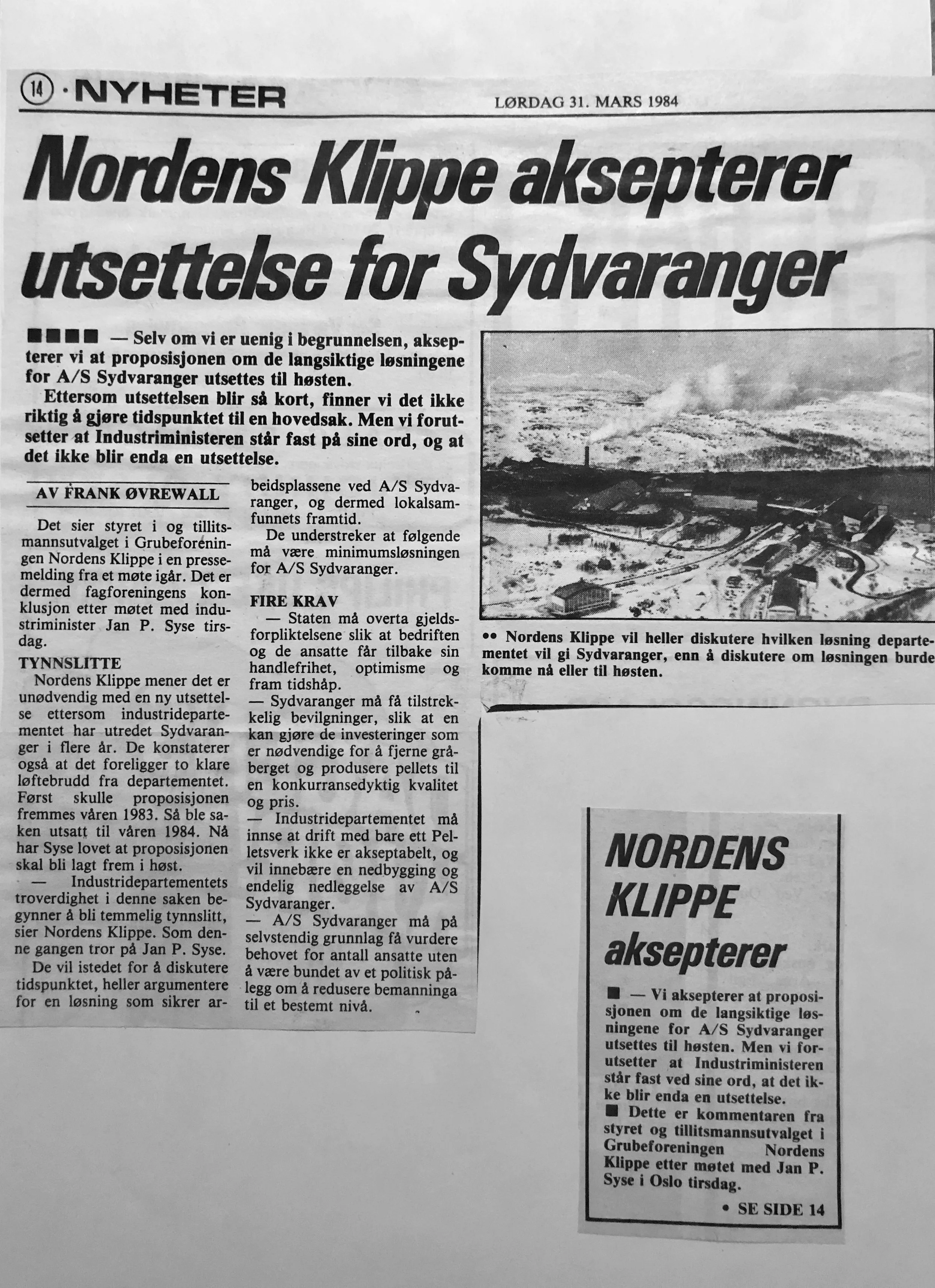 Faksimilene av presseoppslagene er ikke sortert i kronologisk rekkefølge. Jeg har, etter beste skjønn, gjort et utvalg av det massive materialet. Denne oversikten er ment å gi et visuelt - ikke nødvendigvis lesbart - inntrykk av den omfattende dekningen av Nordens Klippes kamp for arbeidsplasser og bosetting på midten av 1980-tallet, situasjonen for Sydvaranger og den politiske behandlinga av og kampen om fremtida til A/S Sydvaranger.
