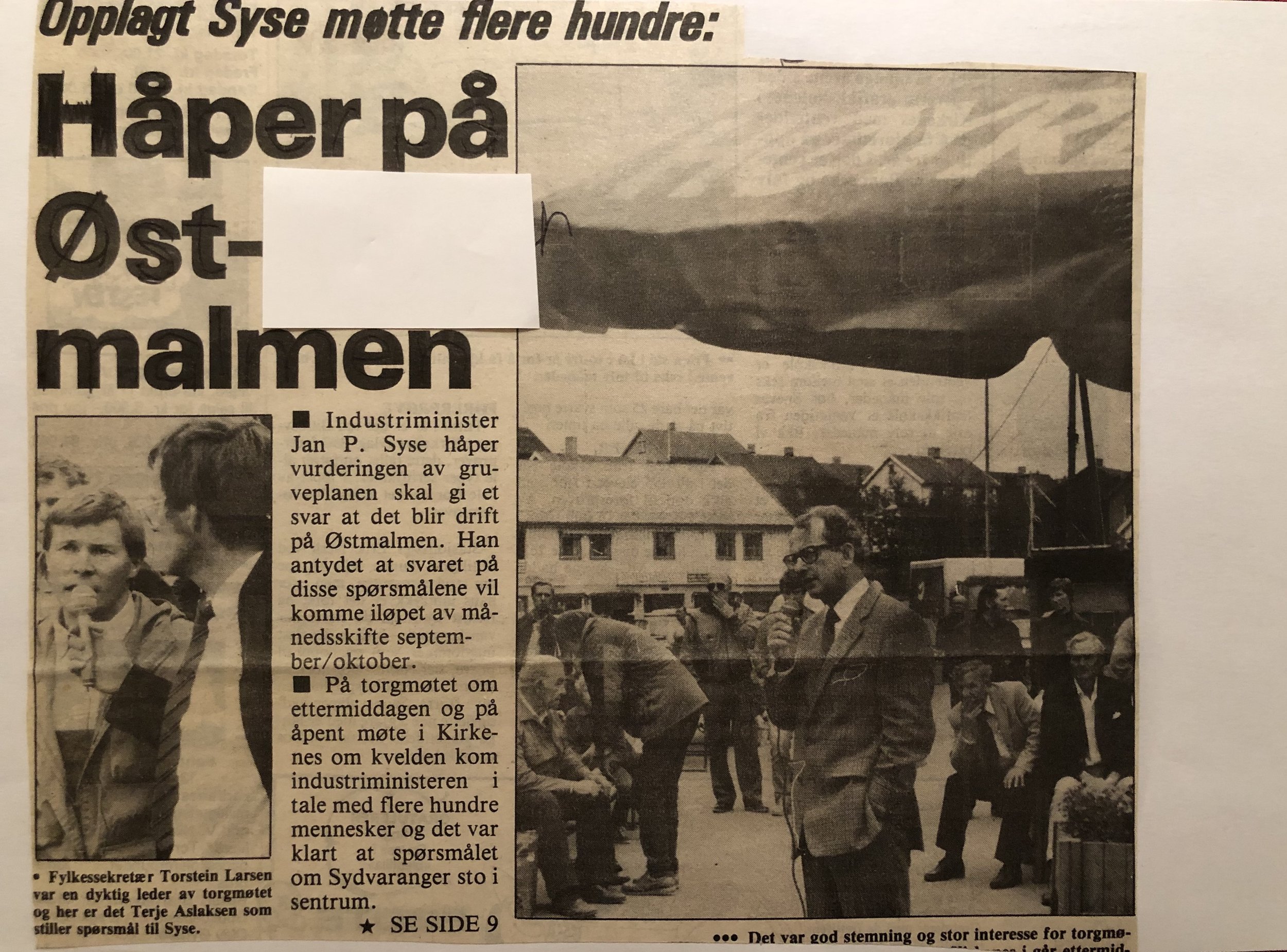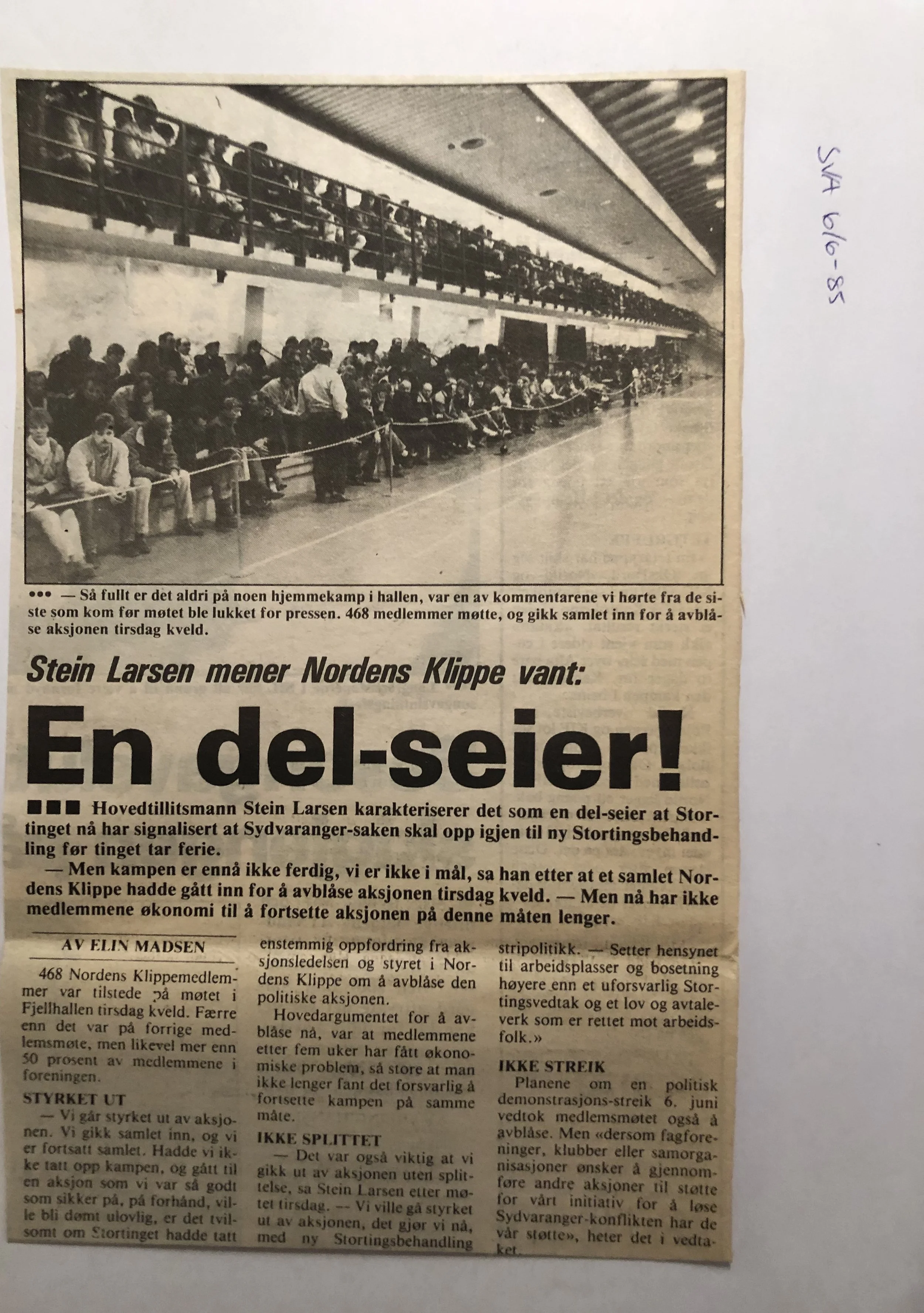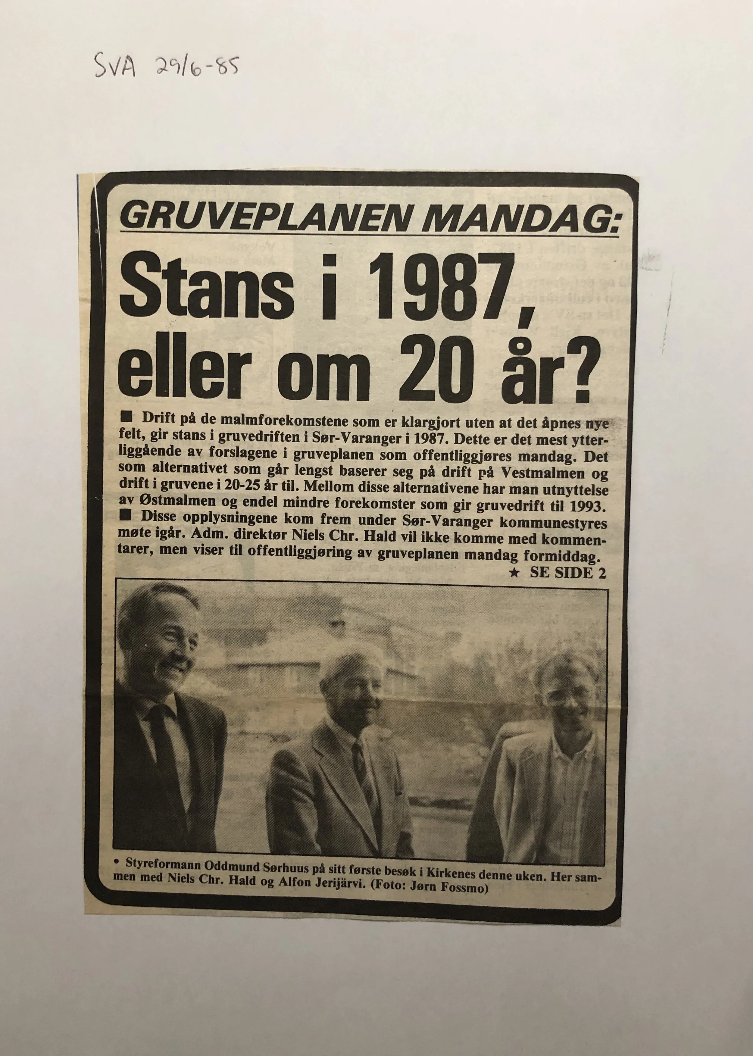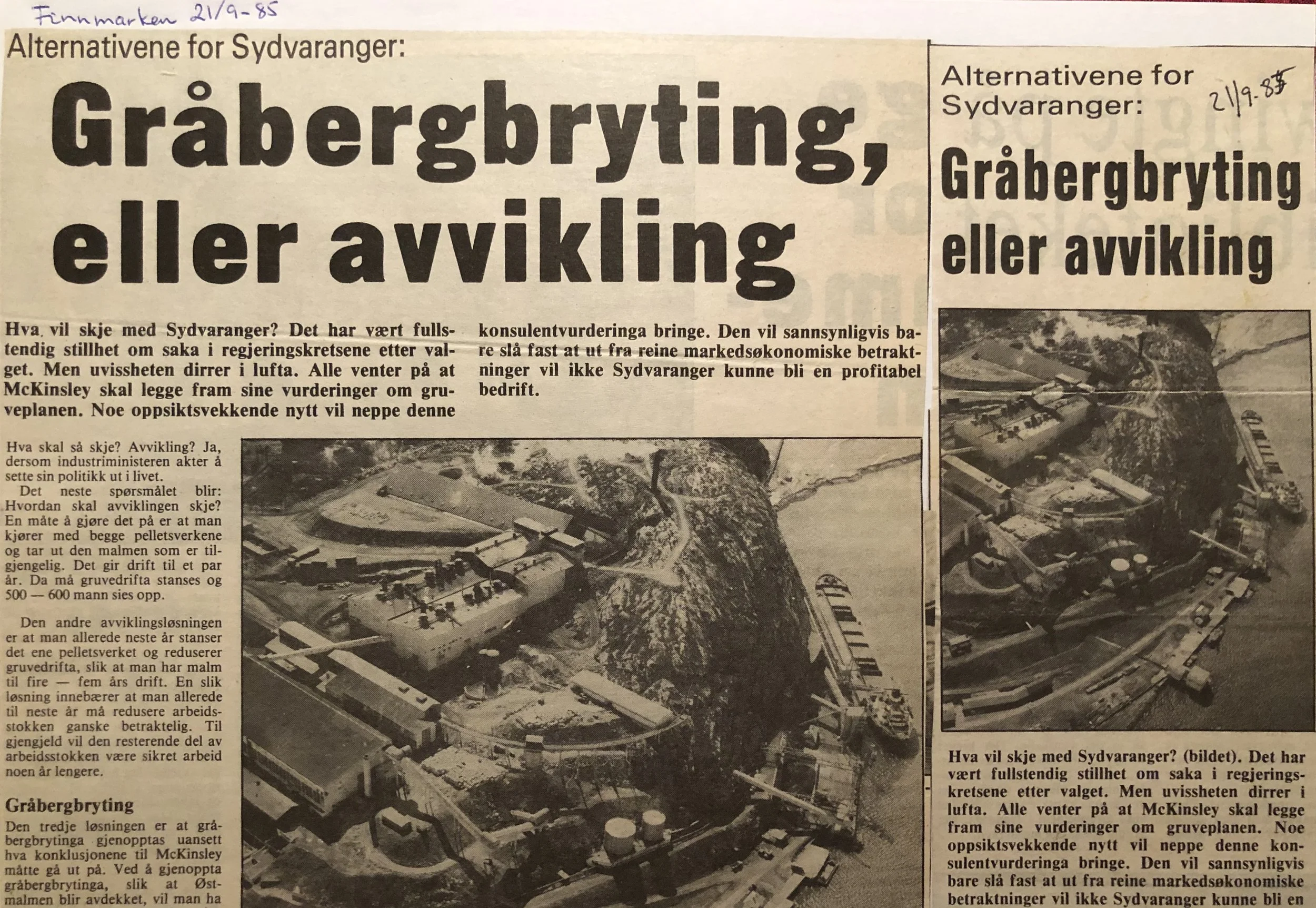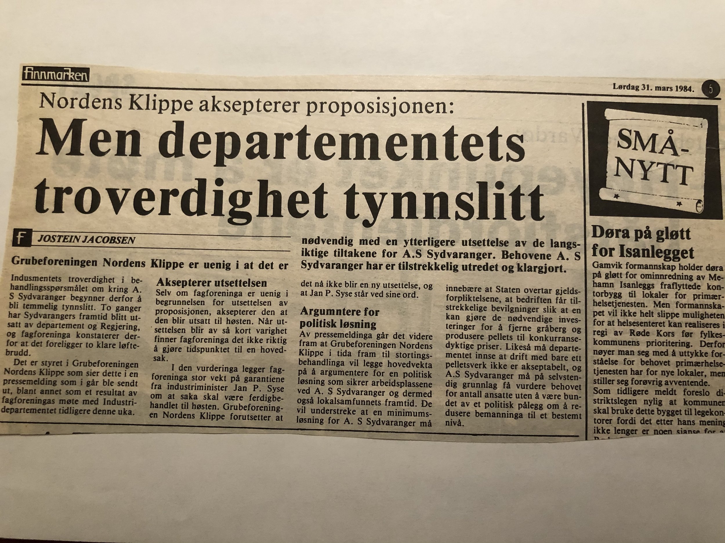 Faksimilene av presseoppslagene er ikke sortert i kronologisk rekkefølge. Jeg har, etter beste skjønn, gjort et utvalg av det massive materialet. Denne oversikten er ment å gi et visuelt - ikke nødvendigvis lesbart - inntrykk av den omfattende dekningen av Nordens Klippes kamp for arbeidsplasser og bosetting på midten av 1980-tallet, situasjonen for Sydvaranger og den politiske behandlinga av og kampen om fremtida til A/S Sydvaranger.