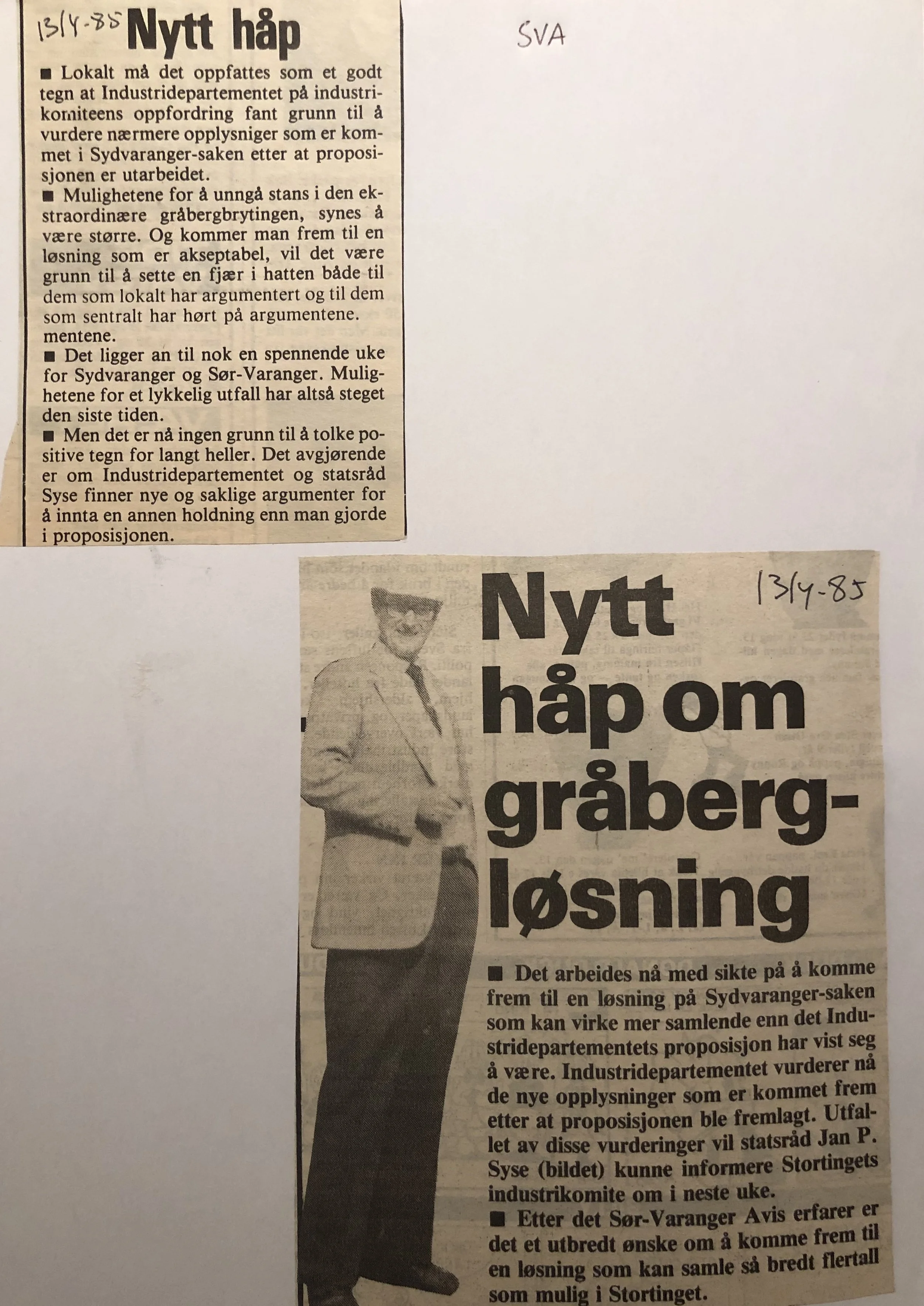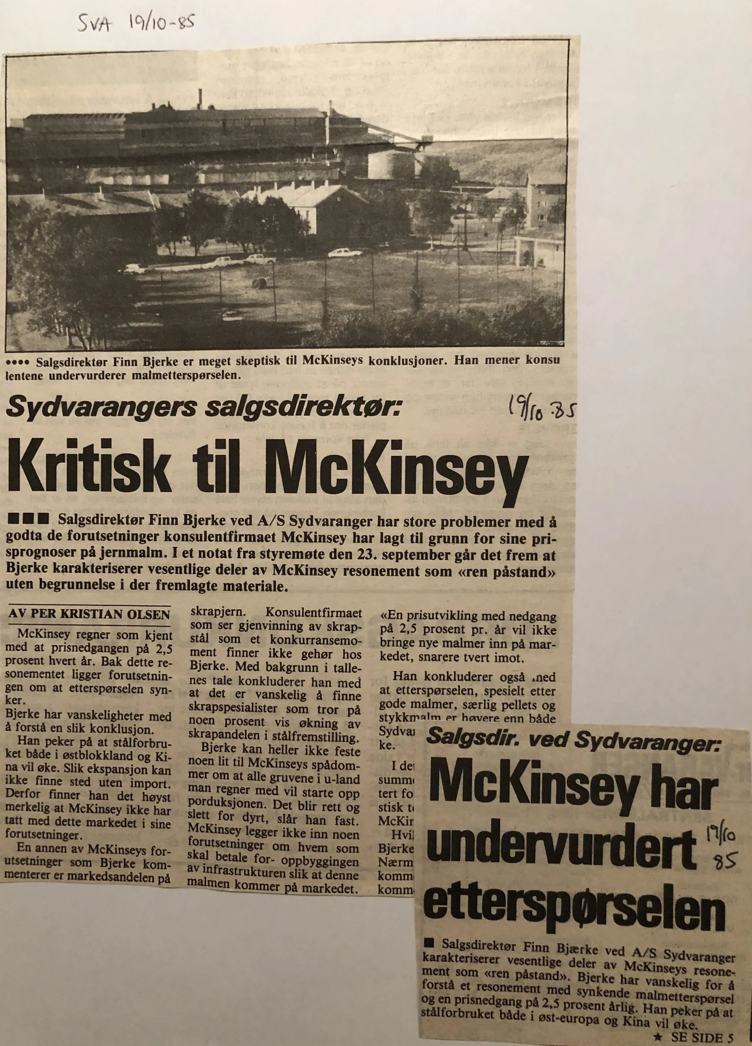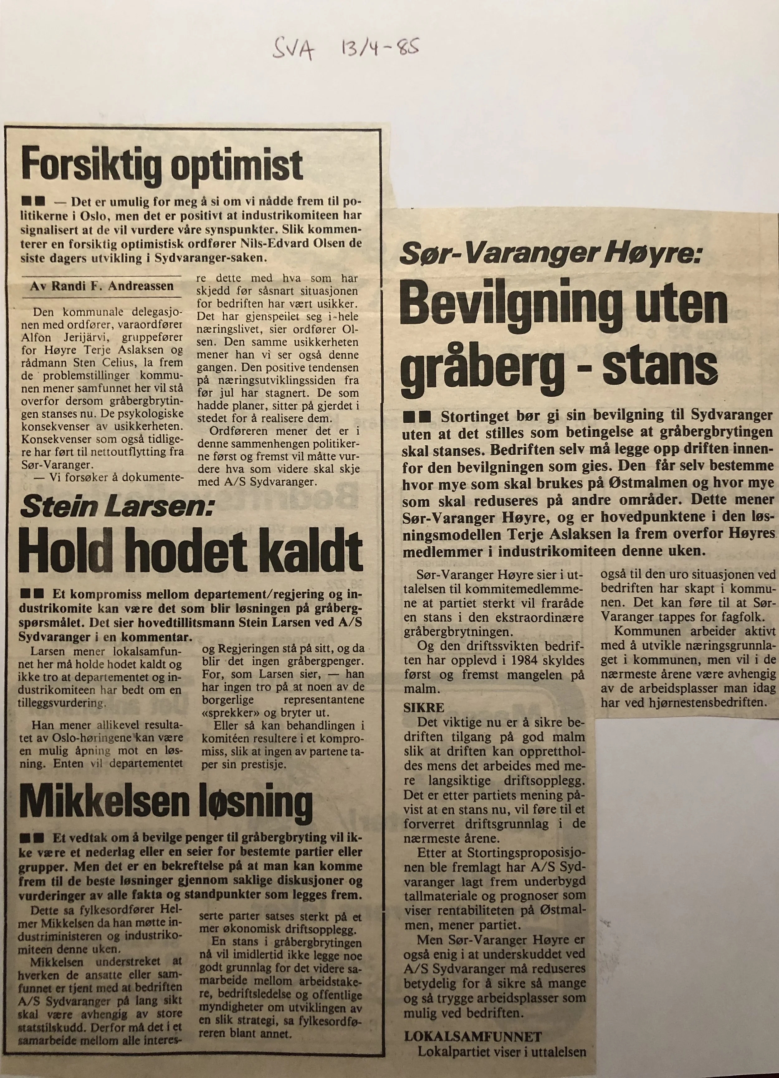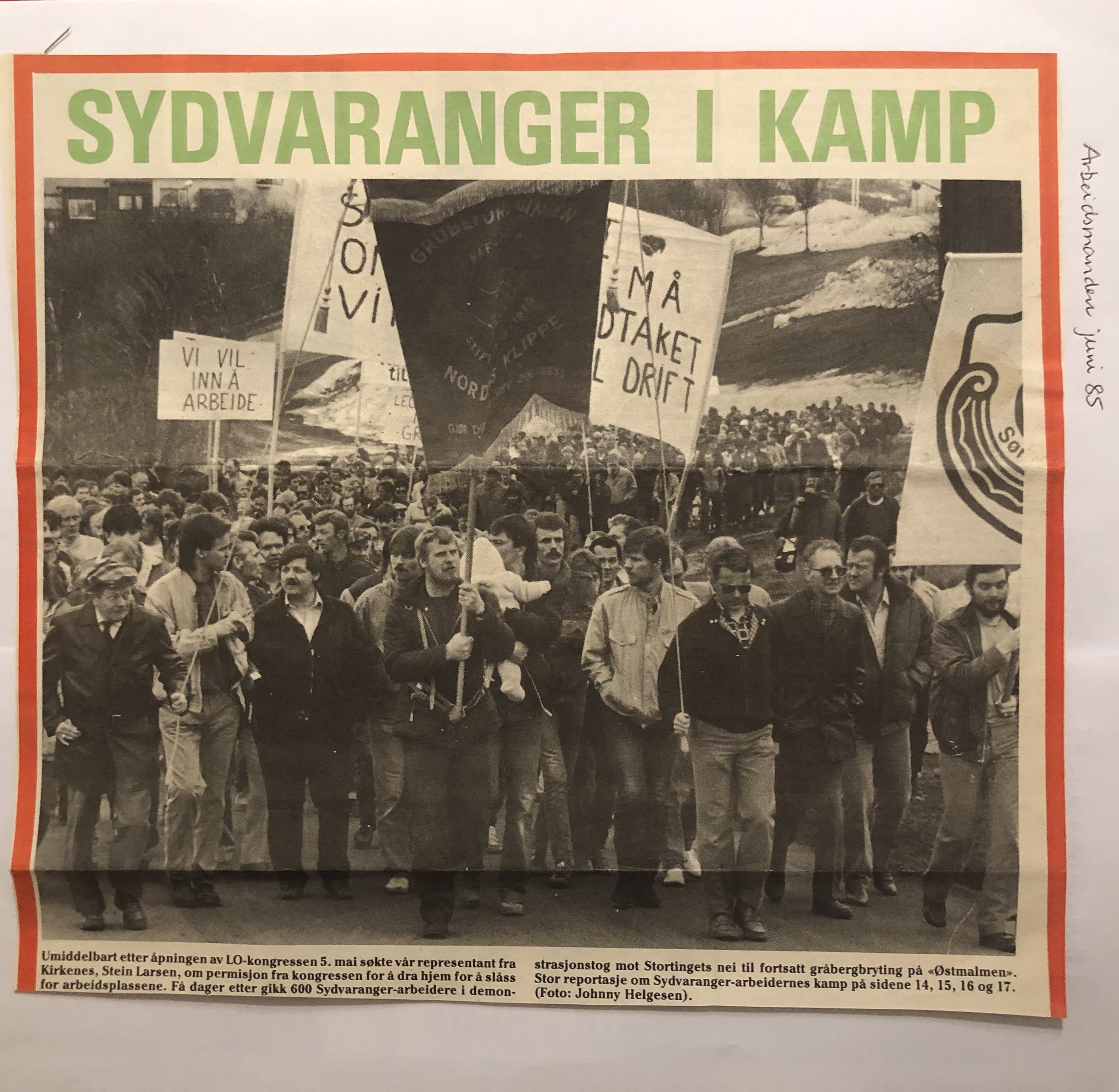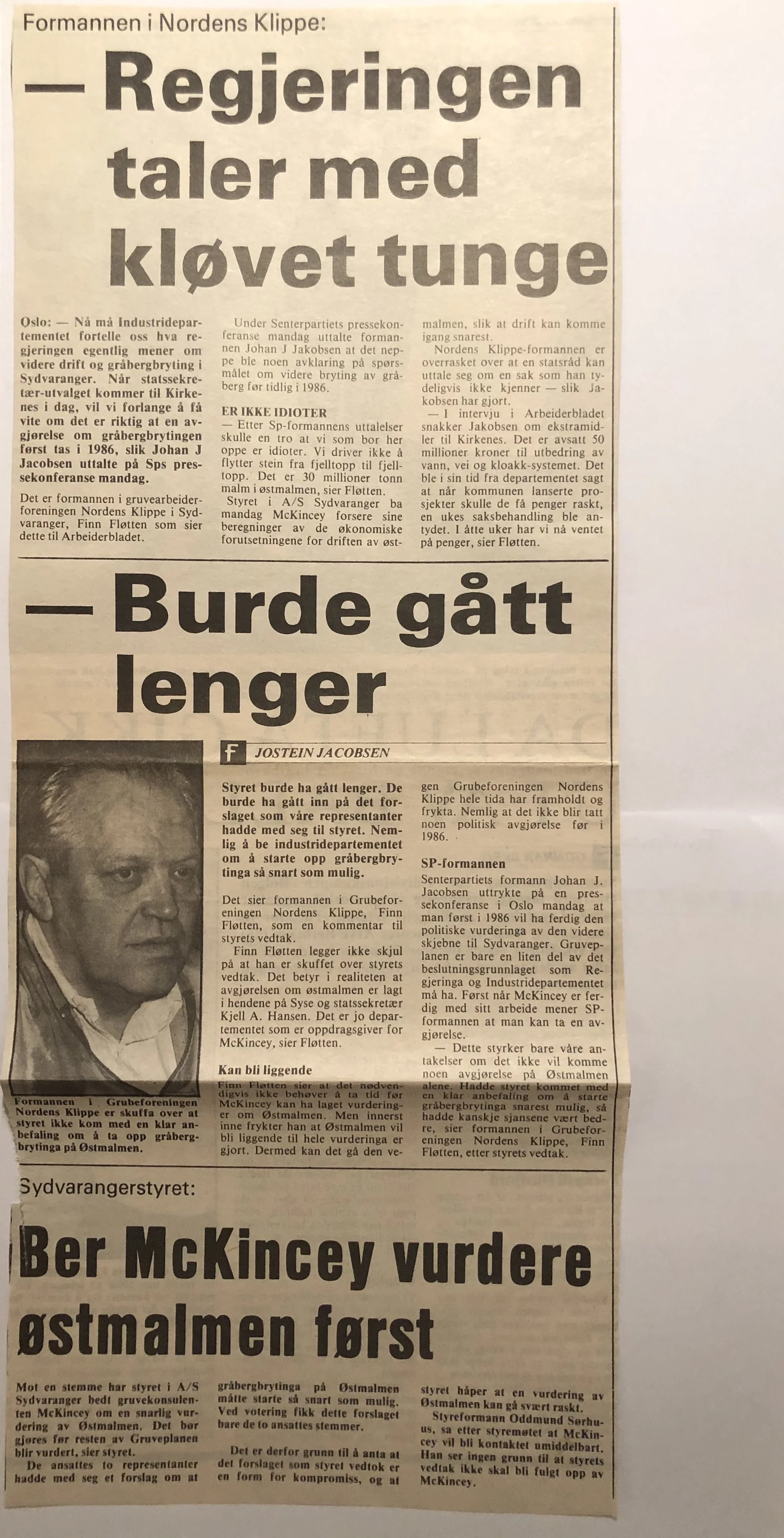 Faksimilene av presseoppslagene er ikke sortert i kronologisk rekkefølge. Jeg har, etter beste skjønn, gjort et utvalg av det massive materialet. Denne oversikten er ment å gi et visuelt - ikke nødvendigvis lesbart - inntrykk av den omfattende dekningen av Nordens Klippes kamp for arbeidsplasser og bosetting på midten av 1980-tallet, situasjonen for Sydvaranger og den politiske behandlinga av og kampen om fremtida til A/S Sydvaranger.