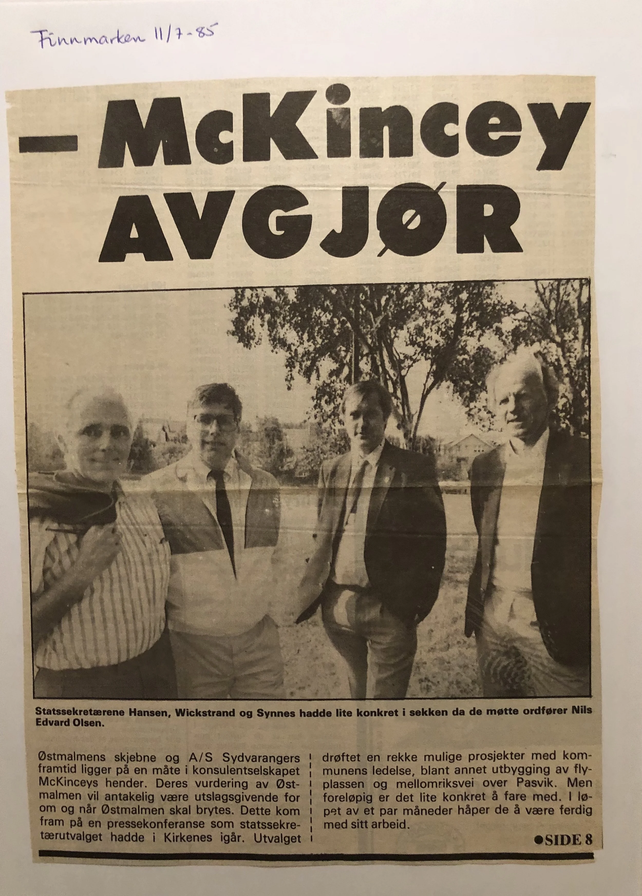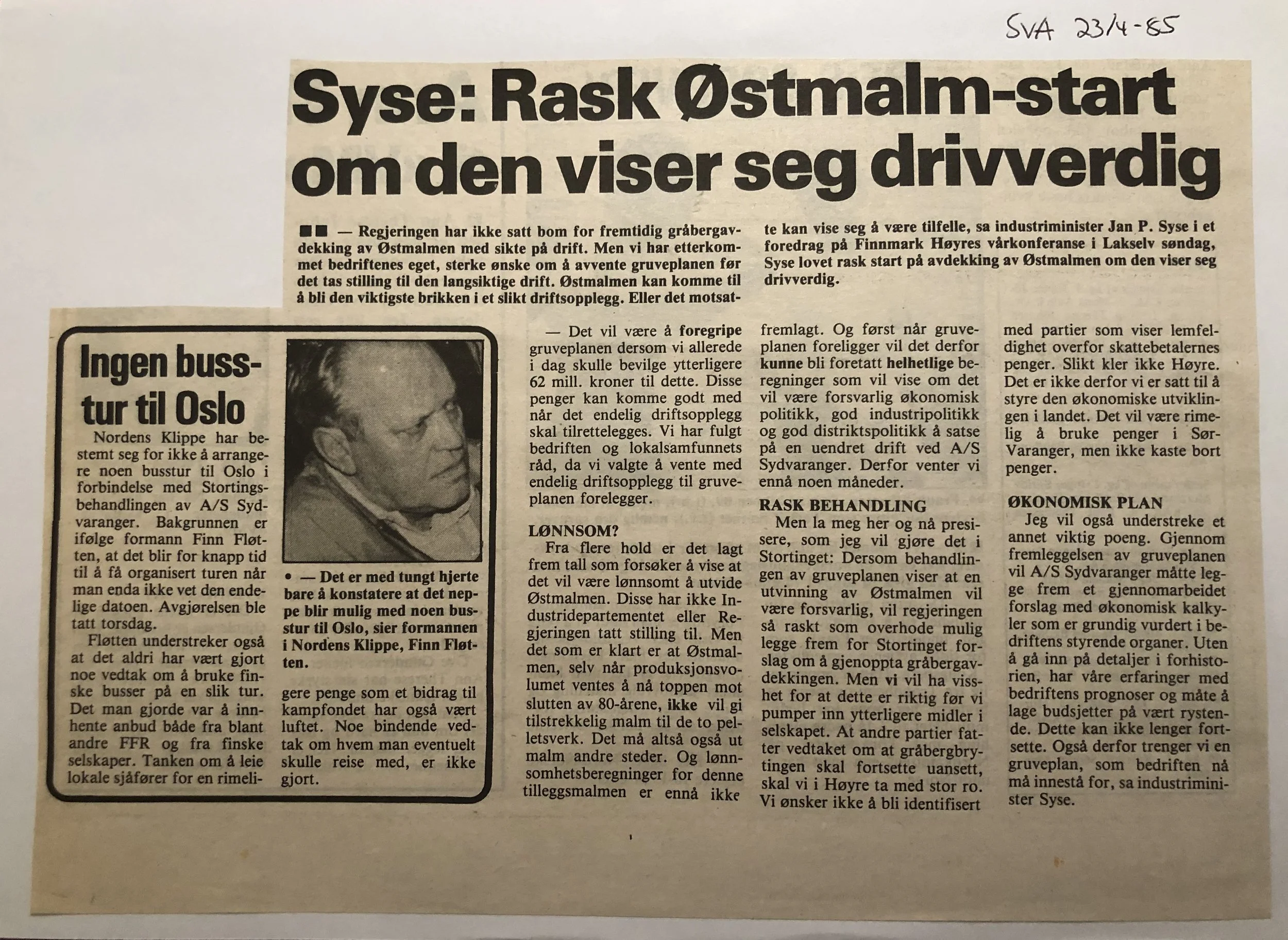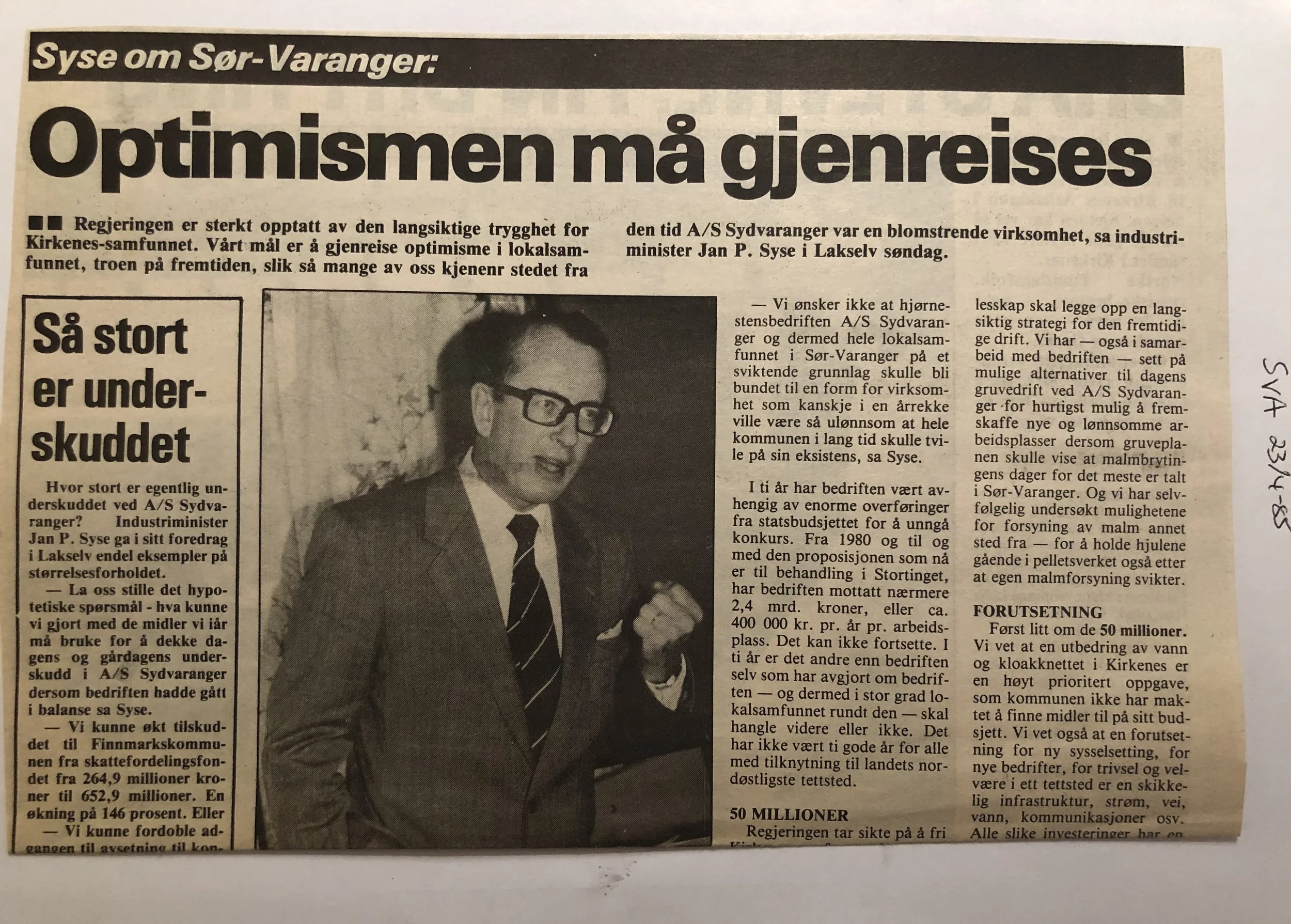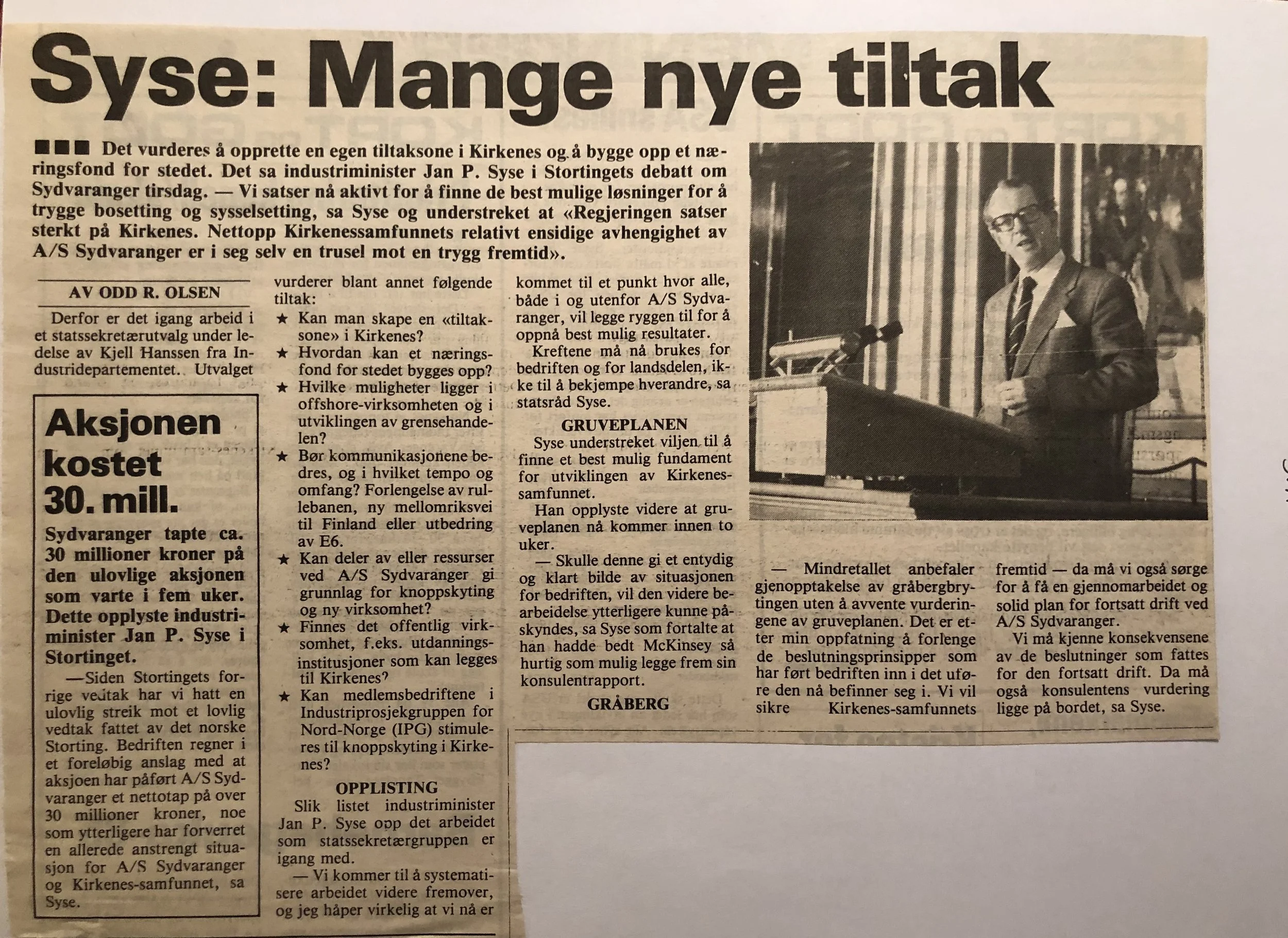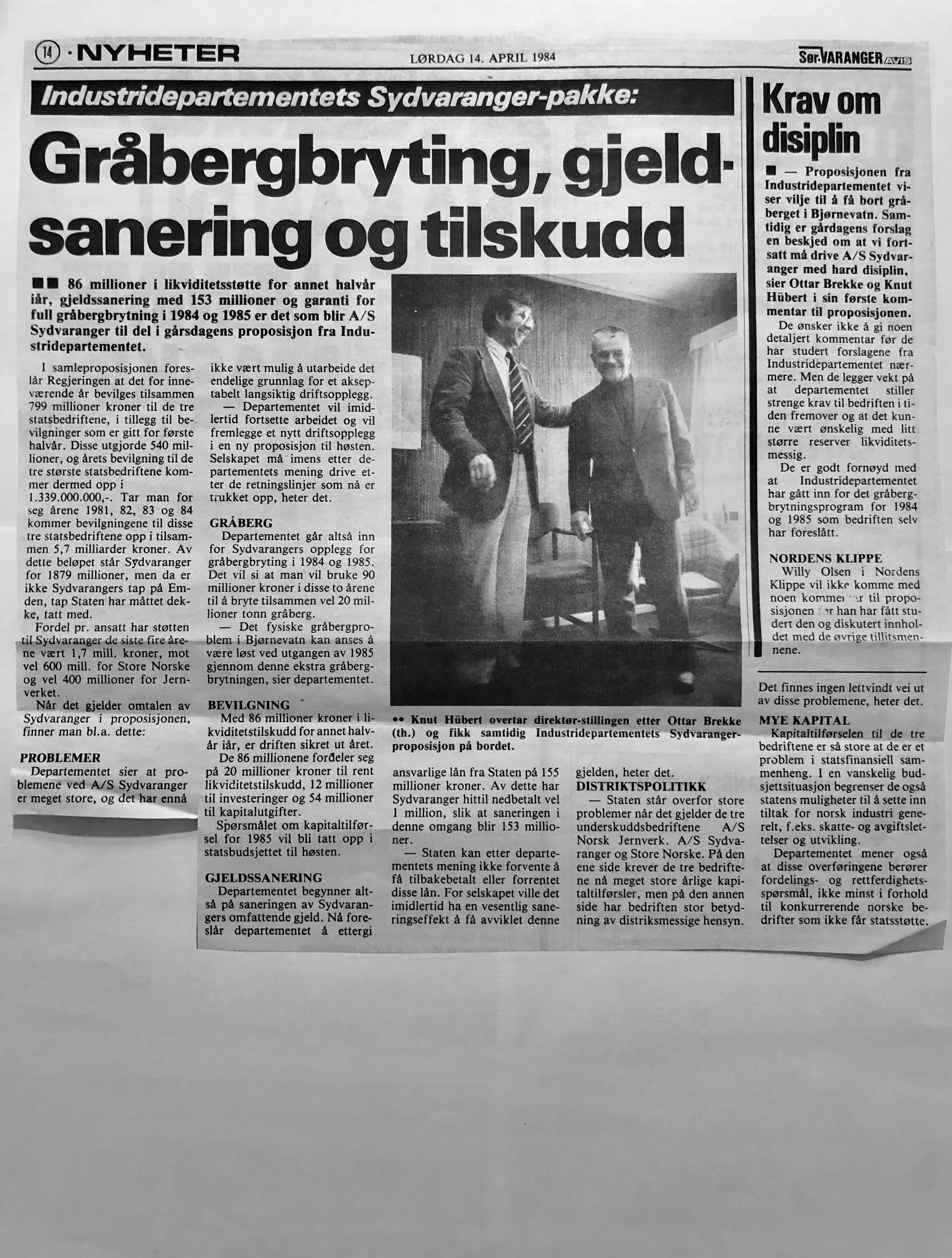 Faksimilene av presseoppslagene er ikke sortert i kronologisk rekkefølge. Jeg har, etter beste skjønn, gjort et utvalg av det massive materialet. Denne oversikten er ment å gi et visuelt - ikke nødvendigvis lesbart - inntrykk av den omfattende dekningen av Nordens Klippes kamp for arbeidsplasser og bosetting på midten av 1980-tallet, situasjonen for Sydvaranger og den politiske behandlinga av og kampen om fremtida til A/S Sydvaranger.