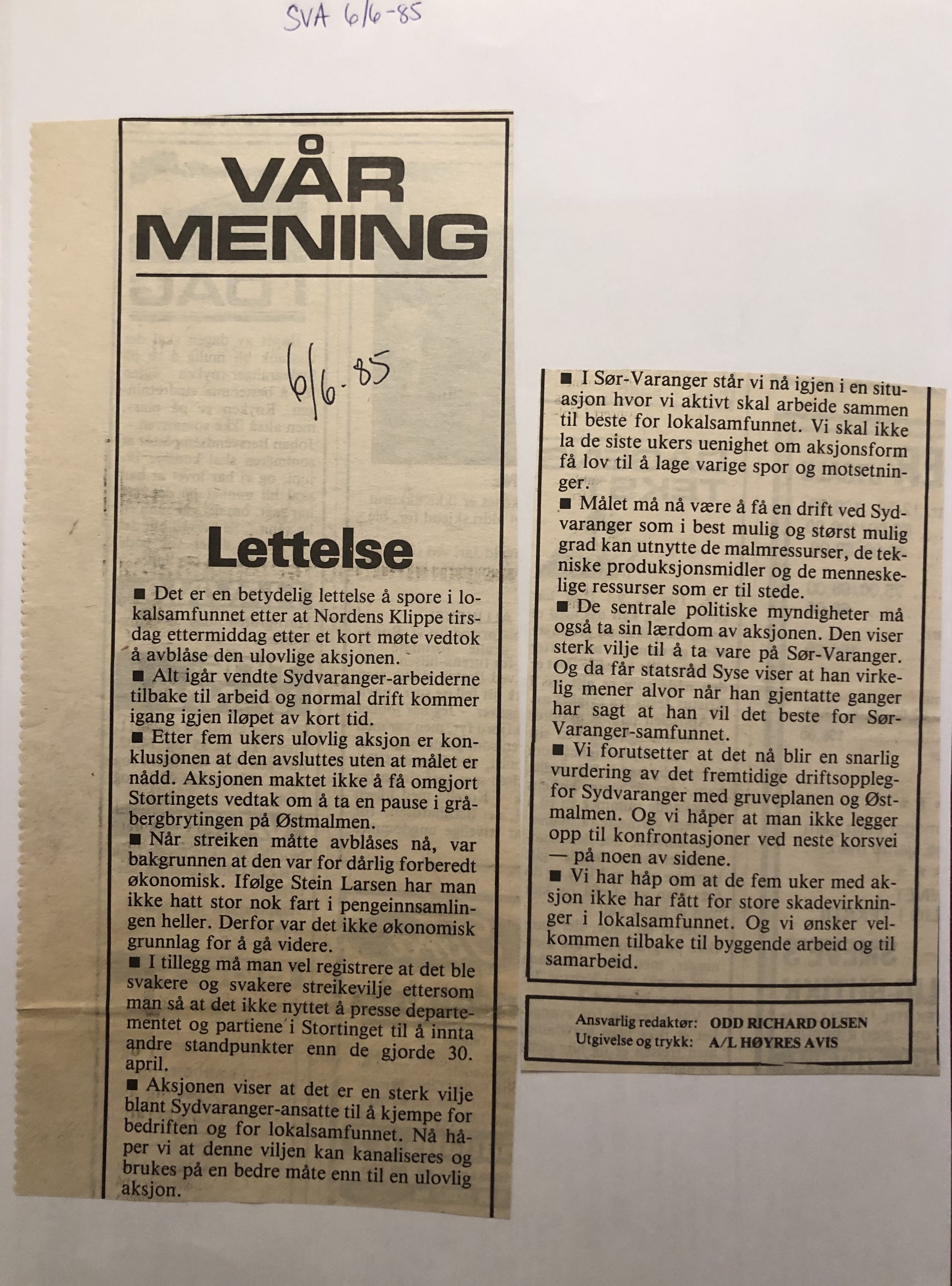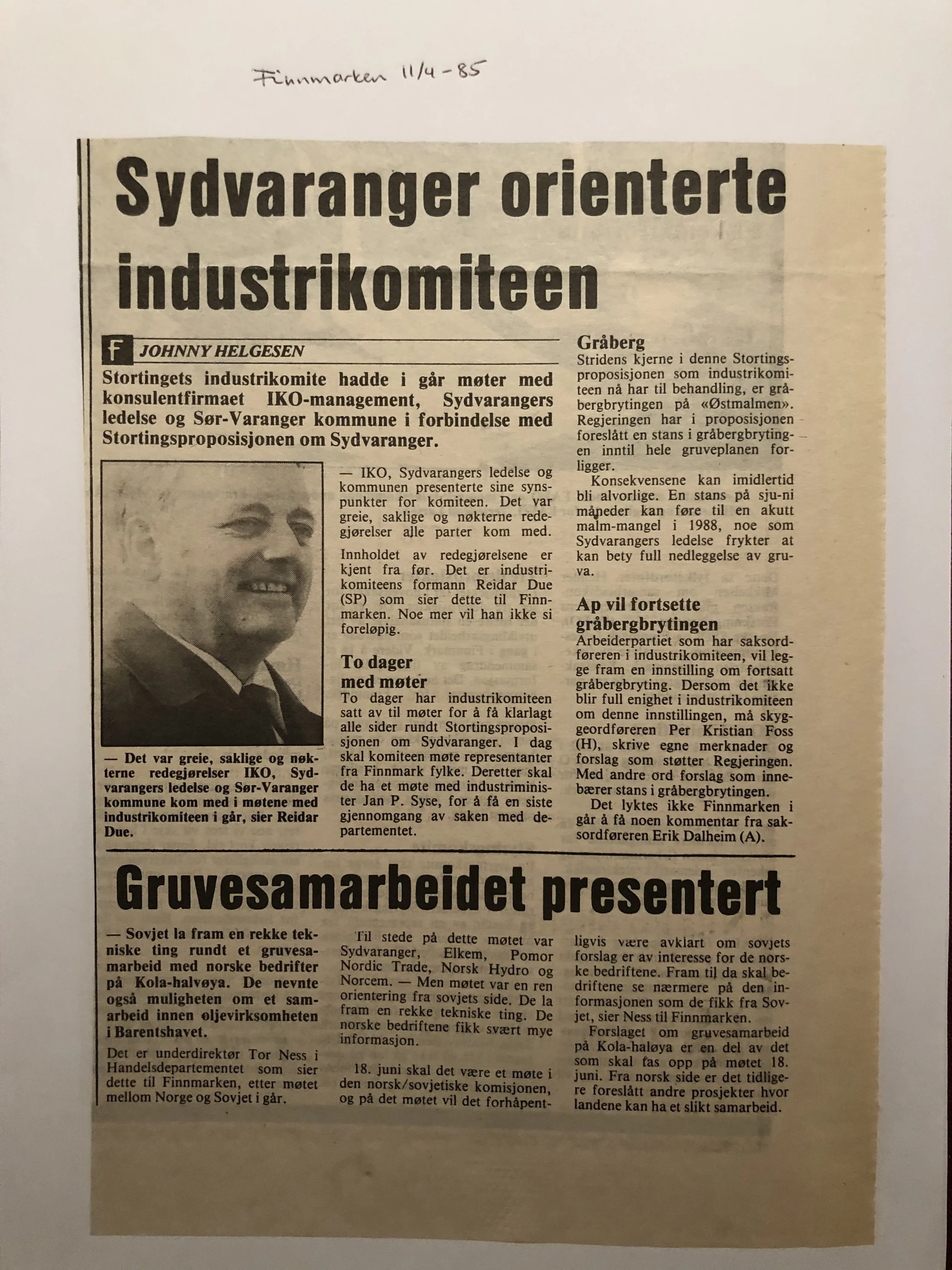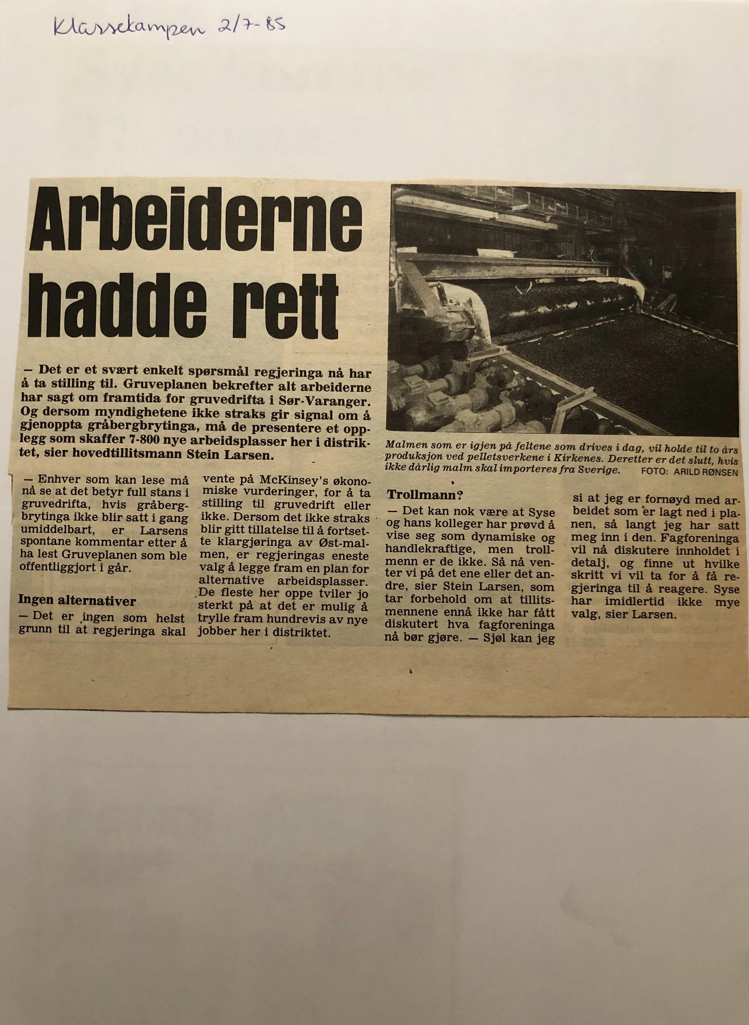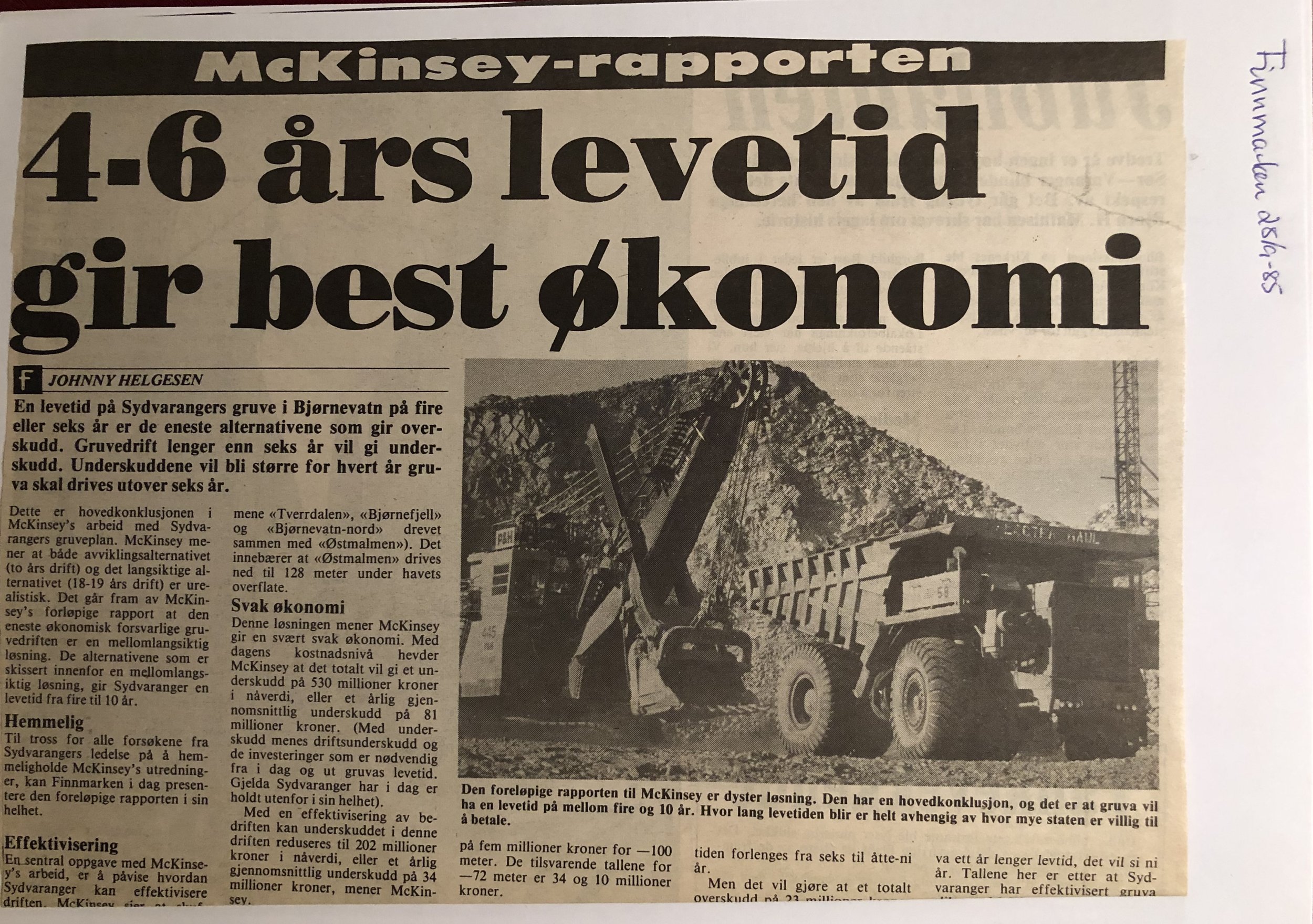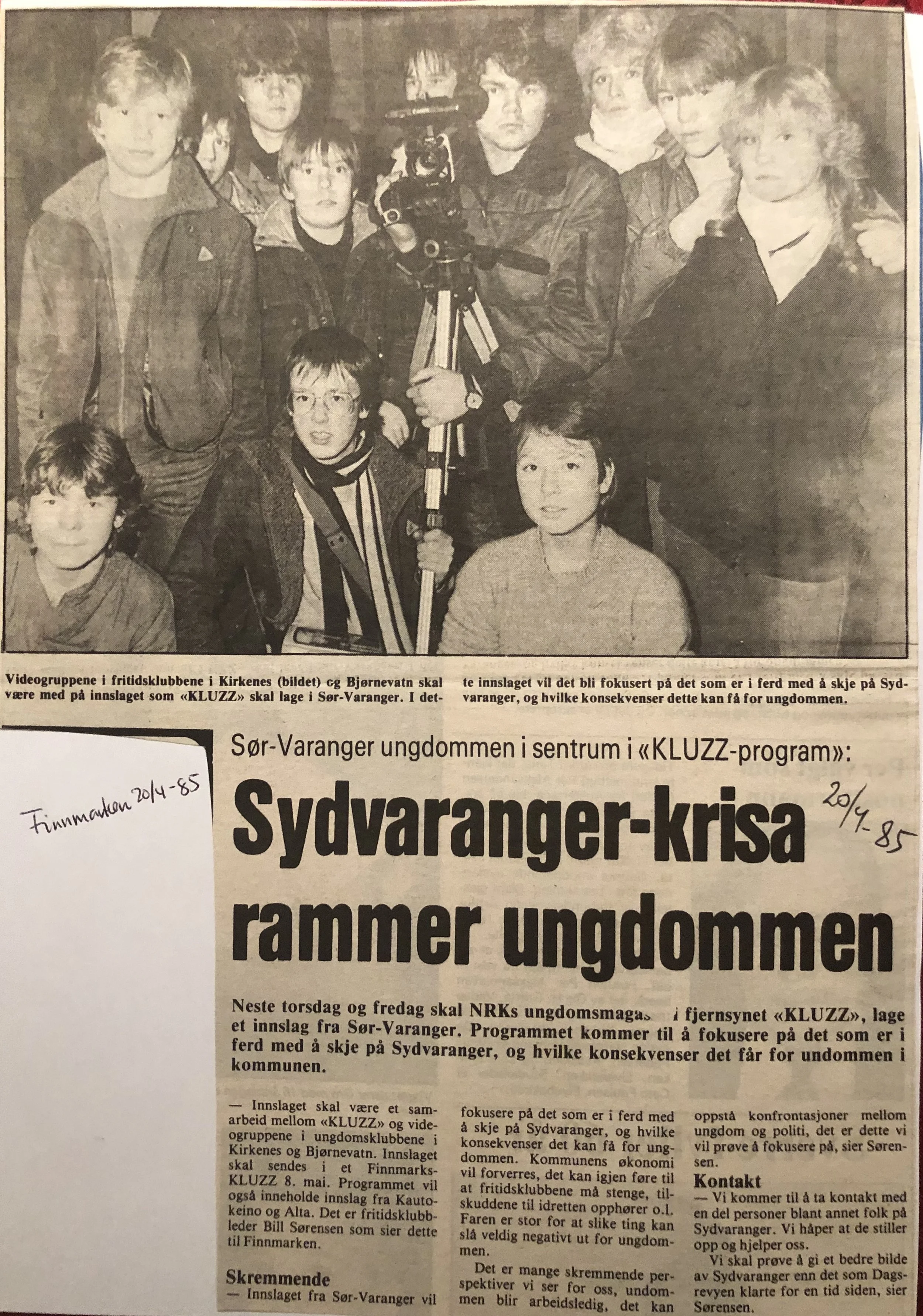 Faksimilene av presseoppslagene er ikke sortert i kronologisk rekkefølge. Jeg har, etter beste skjønn, gjort et utvalg av det massive materialet. Denne oversikten er ment å gi et visuelt - ikke nødvendigvis lesbart - inntrykk av den omfattende dekningen av Nordens Klippes kamp for arbeidsplasser og bosetting på midten av 1980-tallet, situasjonen for Sydvaranger og den politiske behandlinga av og kampen om fremtida til A/S Sydvaranger.